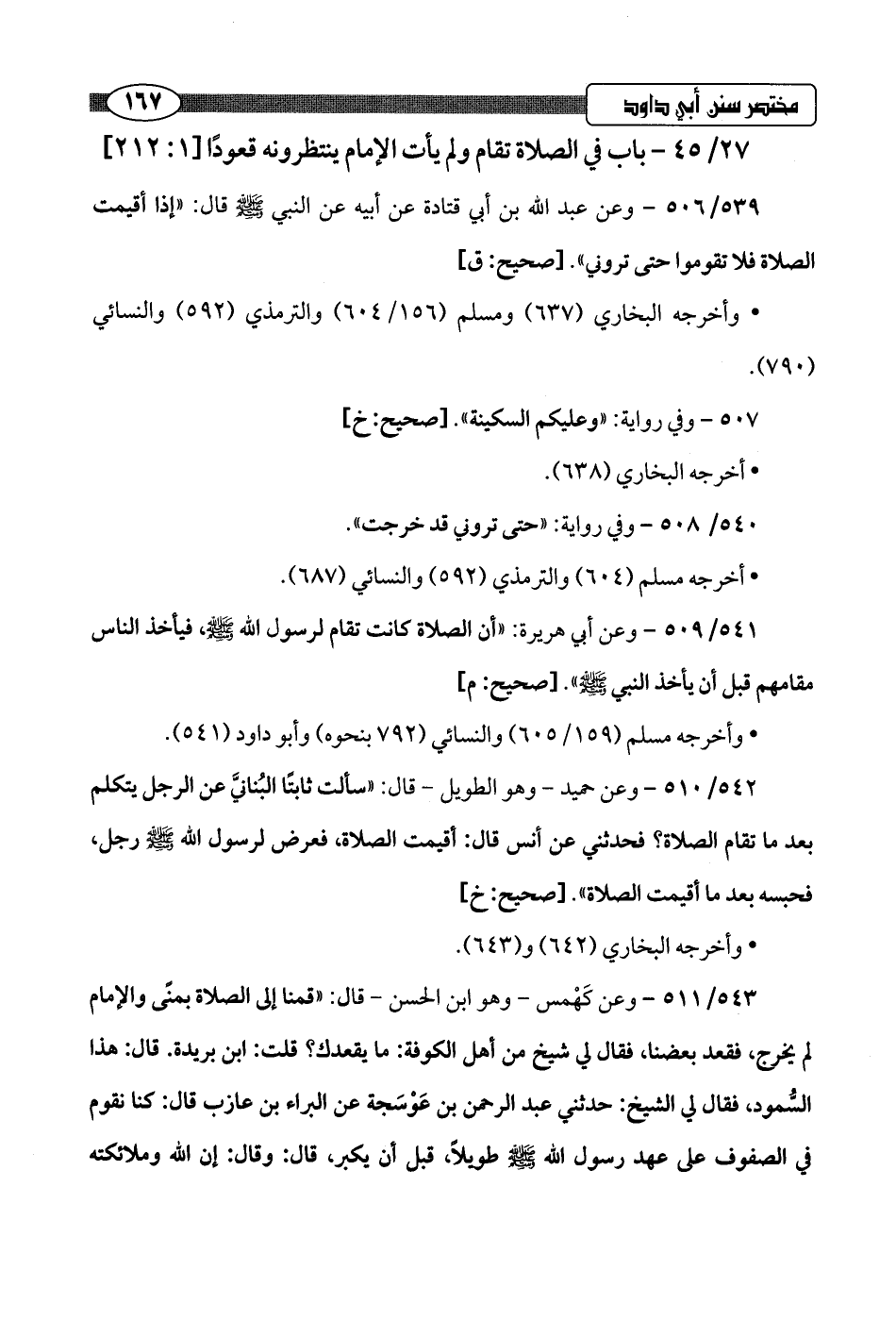 542/ 510 - وعن حميد -وهو الطويل- قال: "سألت ثابتًا البُنانيَّ عن الرجل يتكلم بعد ما تقام الصلاة؟ فحدثني عن أنس قال: أقيمت الصلاة، فعرض لرسول اللَّه -صلى اللَّه عليه وسلم- رجل، فحبسه بعد ما أقيمت الصلاة".hصحيح: خ]