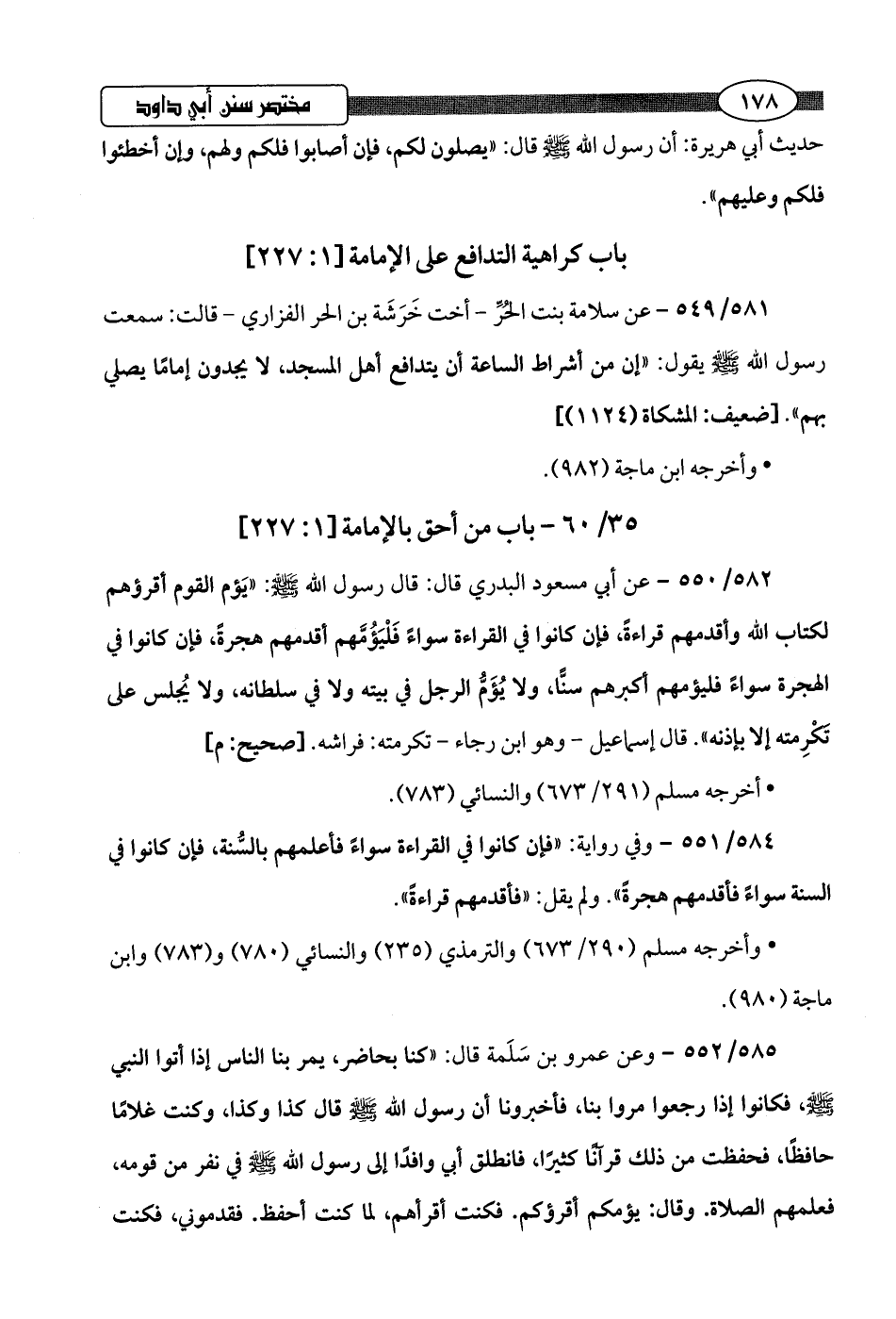 584/ 551 - وفي رواية: "فإن كانوا في القراءة سواءً فأعلمهم بالسُّنة، فإن كانوا في السنة سواءً فأقدمهم هجرةً". ولم يقل: "فأقدمهم قراءةً".