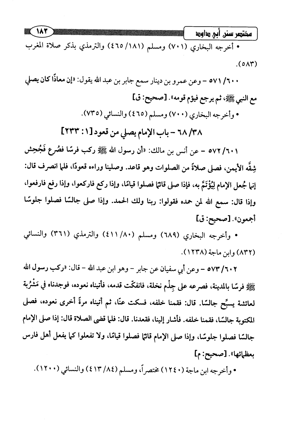 601/ 572 - عن أنس بن مالك: "أن رسول اللَّه -صلى اللَّه عليه وسلم- ركب فرسًا فصُرع فَجُحِش شِقَّه الأيمن، فصلى صلاةً من الصلوات وهو قاعد. وصلينا وراءه قعودًا، فلما انصرف قال: إنما جُعل الإمام لِيُؤْتَمَّ به، فإذا صلى قائمًا فصلوا قيامًا، وإذا ركع فاركعوا، وإذا رفع فارفعوا، وإذا قال: سمع اللَّه لمن حمده فقولوا: ربنا ولك الحمد. وإذا صلى جالسًا فصلوا جلوسًا أجمعون"hصحيح: ق]