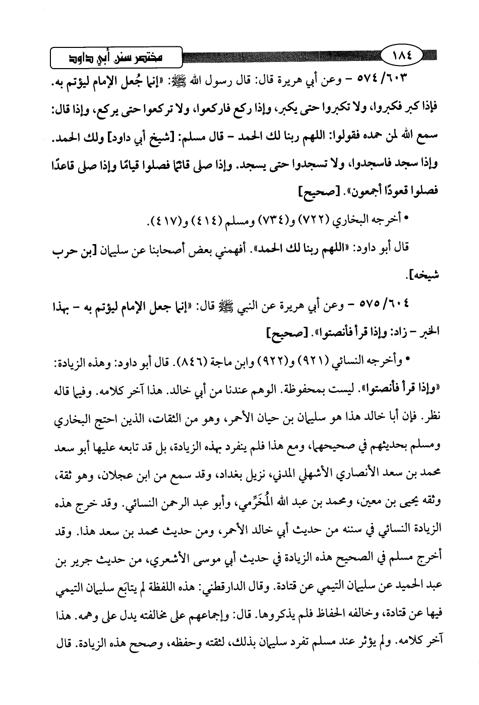 603/ 574 - وعن أبي هريرة قال: قال رسول اللَّه -صلى اللَّه عليه وسلم-: "إنما جُعل الإمام ليؤتم به. فإذا كبر فكبروا، ولا تكبروا حتى يكبر، وإذا ركع فاركعوا، ولا تركعوا حتى يركع، وإذا قال: سمع اللَّه لمن حمده فقولوا: اللهم ربنا لك الحمد -قال مسلم: [شيخ أبي داود] ولك الحمد. وإذا سجد فاسجدوا، ولا تسجدوا حتى يسجد. وإذا صلى قائمًا فصلوا قيامًا وإذا صلى قاعدًا فصلوا قعودًا أجمعون".hصحيح]