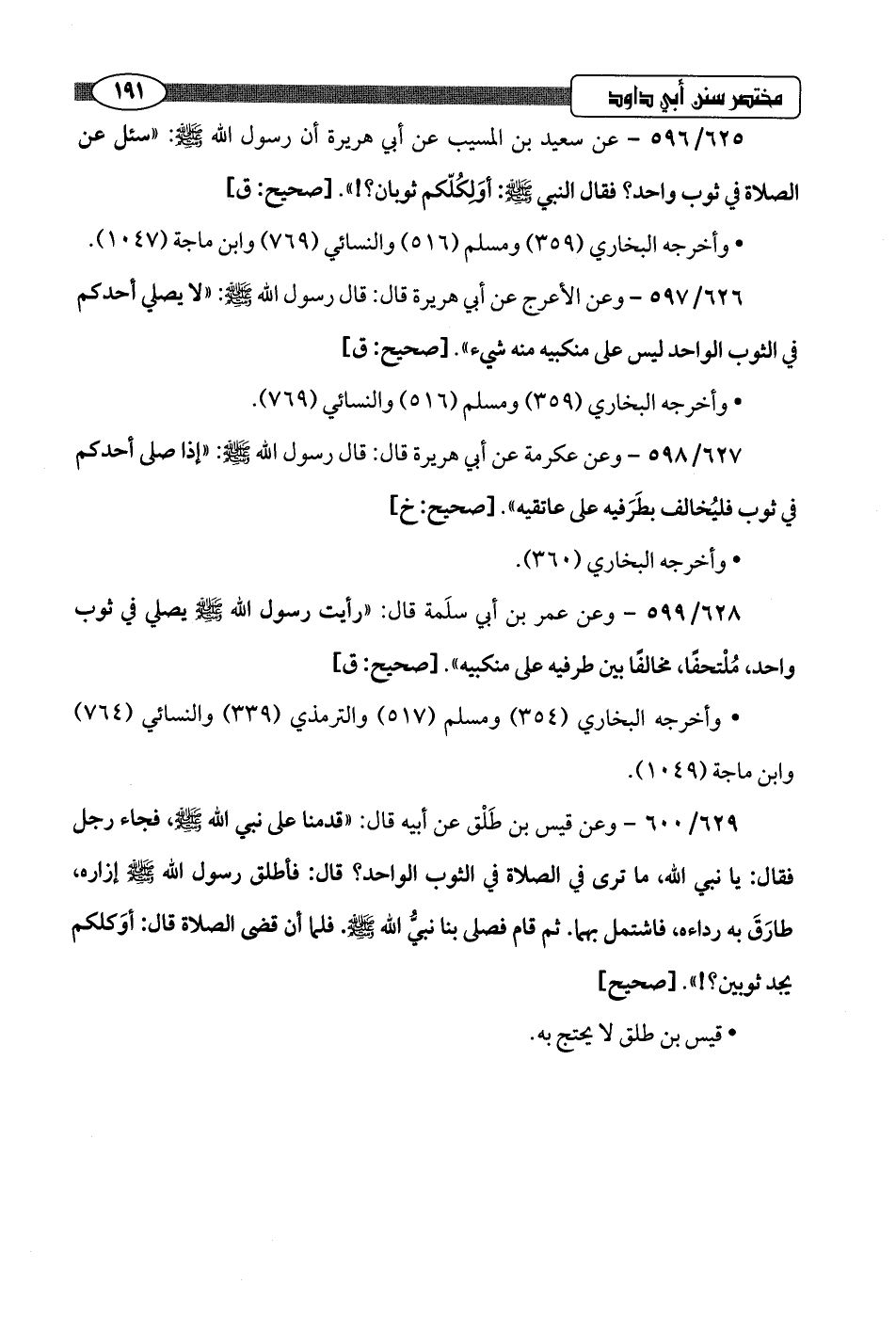 625/ 596 - عن سعيد بن المسيب عن أبي هريرة أن رسول اللَّه -صلى اللَّه عليه وسلم-: "سئل عن الصلاة في ثوب واحد؟ فقال النبي -صلى اللَّه عليه وسلم-: أوَلِكُلّكم ثوبان؟ ".hصحيح: ق]