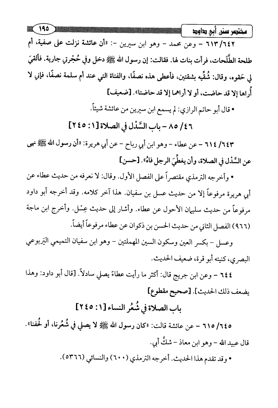644 - وعن ابن جريج قال: أكثر ما رأيت عطاءً يصلي سادلًا. [قال أبو داود: وهذا يضعف ذلك الحديث].hصحيح مقطوع]