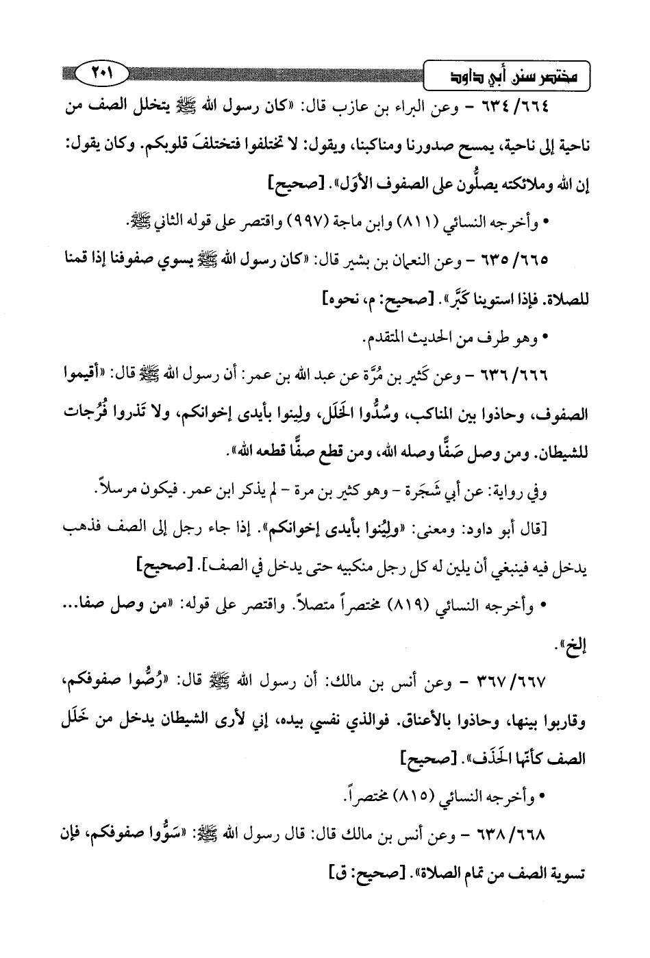 664/ 634 - وعن البراء بن عازب قال: "كان رسول اللَّه -صلى اللَّه عليه وسلم- يتخلل الصف من ناحية إلى ناحية، يمسح صدورنا ومناكبنا، ويقول: لا تختلفوا فتختلفَ قلوبكم. وكان يقول: إن اللَّه وملائكته يصلُّون على الصفوف الأوَل".hصحيح]