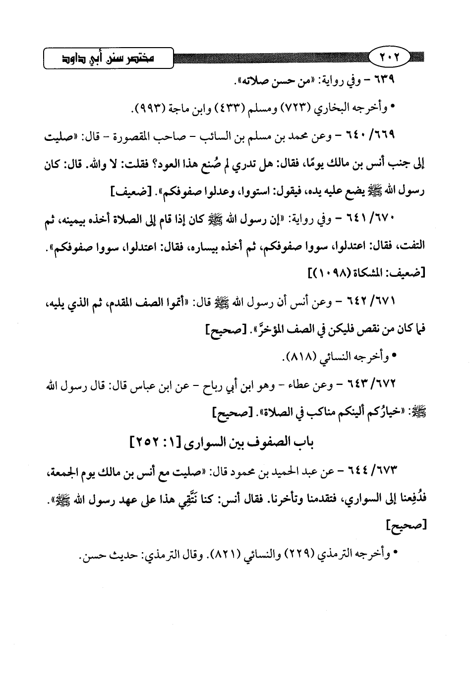 671/ 642 - وعن أنس أن رسول اللَّه -صلى اللَّه عليه وسلم- قال: "أتموا الصف المقدم، ثم الذي يليه، فما كان من نقص فليكن في الصف المؤخر".hصحيح]