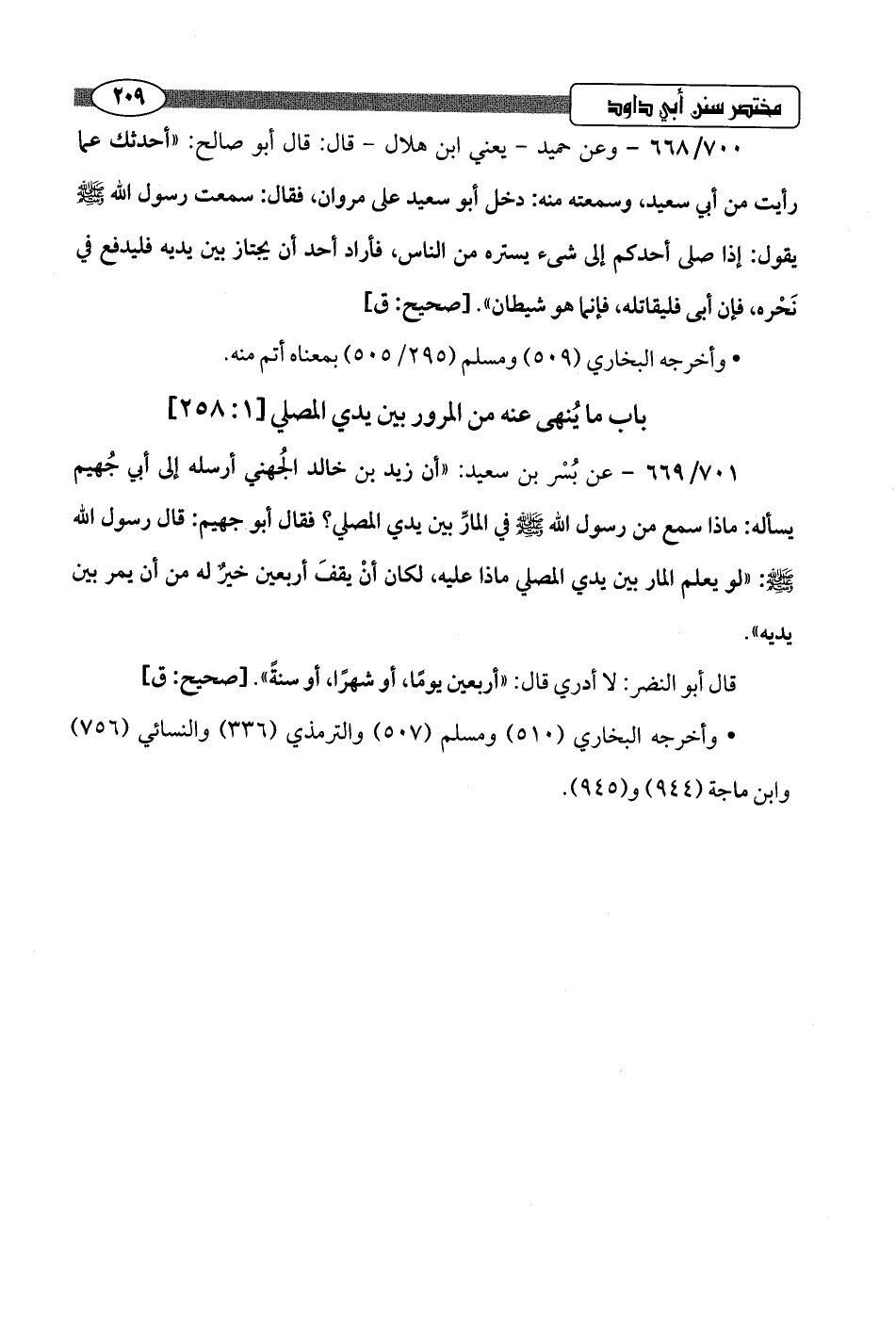 701/ 669 - عن بُسْر بن سعيد: "أن زيد بن خالد الجُهني أرسله إلى أبي جُهيم يسأله: ماذا سمع من رسول اللَّه -صلى اللَّه عليه وسلم- في المارِّ بين يدي المصلي؟ فقال أبو جهيم: قال رسول اللَّه -صلى اللَّه عليه وسلم-: "لو يعلم المار بين يدي المصلي ماذا عليه، لكان أنْ يقفَ أربعين خيرٌ له من أن يمر بين يديه".
