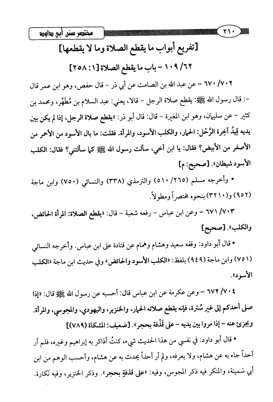 • قال أبو داود: وقفه سعيد وهشام وهمام عن قتادة على ابن عباس. وأخرجه النسائي (751) وابن ماجة (949) بلفظ: "الكلب الأسود والحائض" وفي حديث ابن ماجة "الكلب الأسود".