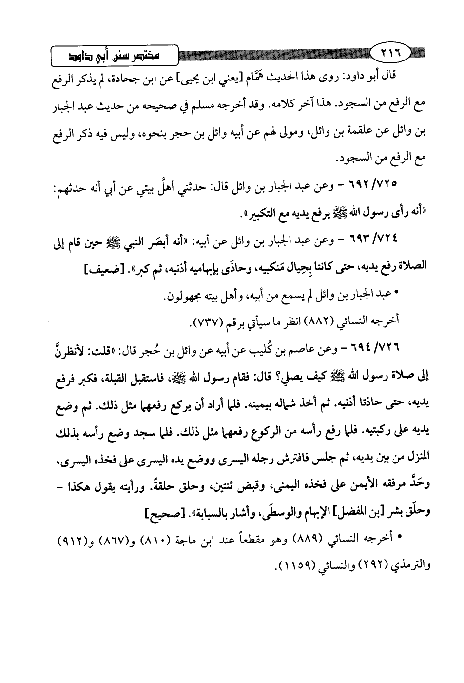 قال أبو داود: روى هذا الحديث هَمَّام [يعني ابن يحيى] عن ابن جحادة، لم يذكر الرفع مع الرفع من السجود. هذا آخر كلامه. وقد أخرجه مسلم في صحيحه من حديث عبد الجبار بن وائل عن علقمة بن وائل، ومولى لهم عن أبيه وائل بن حجر بنحوه، وليس فيه ذكر الرفع مع الرفع من السجود.