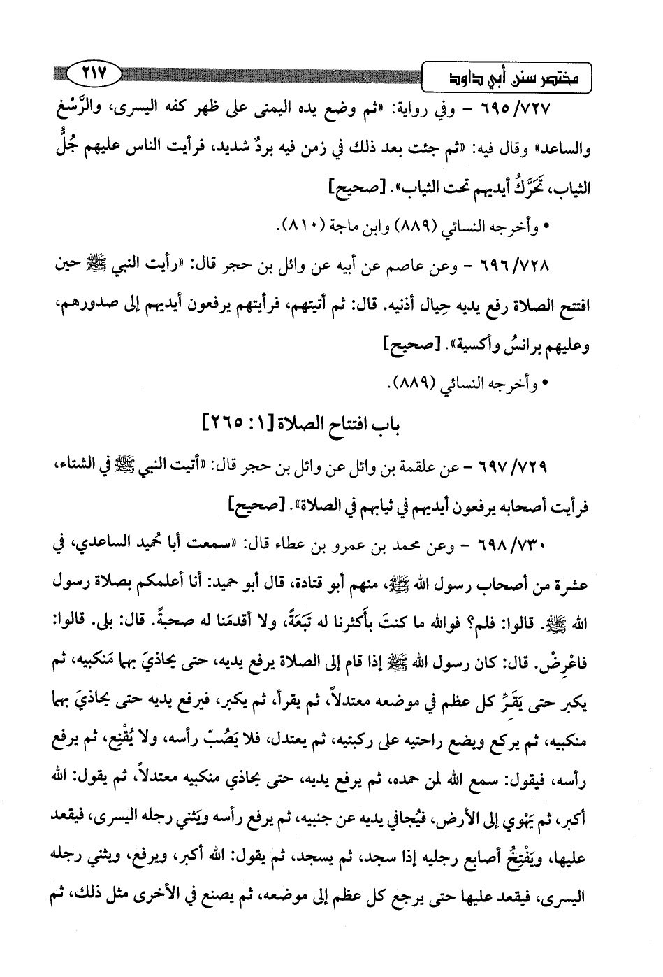 728/ 696 - وعن عاصم عن أبيه عن وائل بن حجر قال: "رأيت النبي -صلى اللَّه عليه وسلم- حين افتتح الصلاة رفع يديه حِيال أذنيه. قال: ثم أتيتهم، فرأيتهم يرفعون أيديهم إلى صدورهم، وعليهم برانسُ وأكسية".hصحيح]
