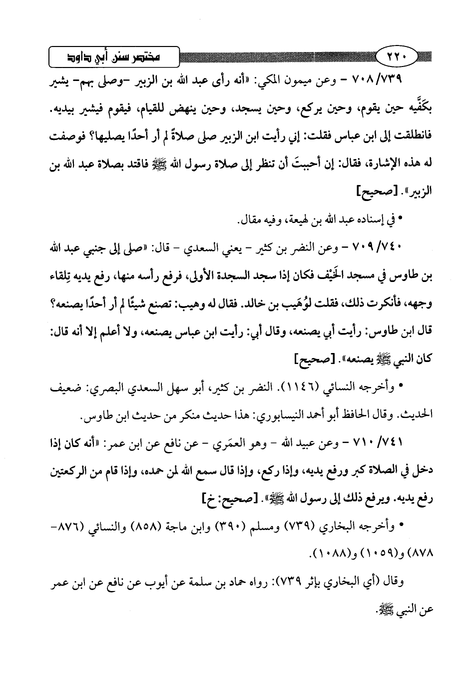 741/ 710 - وعن عبيد اللَّه -وهو العمَري- عن نافع عن ابن عمر: "أنه كان إذا دخل في الصلاة كبر ورفع يديه، وإذا ركع، وإذا قال سمع اللَّه لمن حمده، وإذا قام من الركعتين رفع يديه. ويرفع ذلك إلى رسول اللَّه -صلى اللَّه عليه وسلم-".hصحيح: خ]