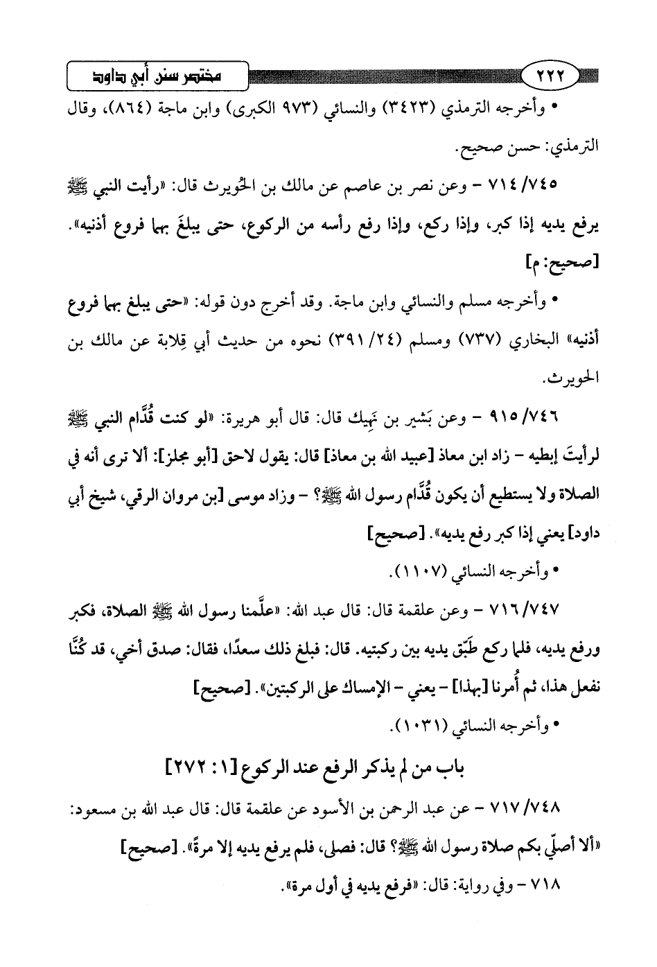 745/ 714 - وعن نصر بن عاصم عن مالك بن الحُويرث قال: "رأيت النبي -صلى اللَّه عليه وسلم- يرفع يديه إذا كبر، وإذا ركع، وإذا رفع رأسه من الركوع، حتى يبلغَ بهما فروع أذنيه".hصحيح: م]