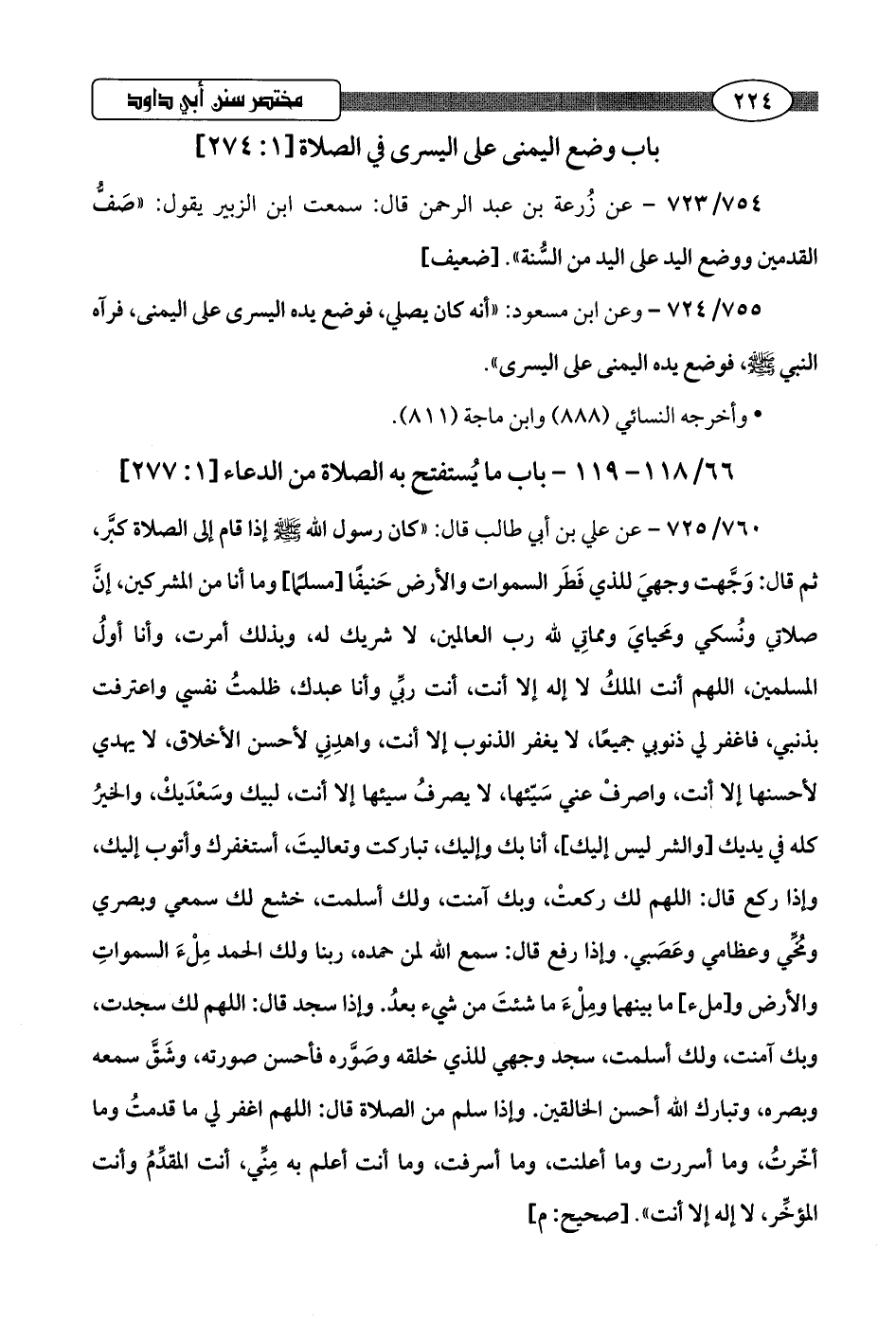 760/ 725 - عن علي بن أبي طالب قال: "كان رسول اللَّه -صلى اللَّه عليه وسلم- إذا قام إلى الصلاة كبَّر، ثم قال: وَجَّهت وجهيَ للذي فَطَر السموات والأرض حَنيفًا [مسلمًا] وما أنا من المشركين، إنَّ صلاتي ونُسكي ومَحيايَ ومماتِي للَّه رب العالمين، لا شريك له، وبذلك أمرت، وأنا أولُ المسلمين، اللهم أنت الملكُ لا إله إلا أنت، أنت ربِّي وأنا عبدك، ظلمتُ نفسي واعترفت بذنبي، فاغفر لي ذنوبي جميعًا، لا يغفر الذنوب إلا أنت، واهدِنِي لأحسن الأخلاق، لا يهدي لأحسنها إلا أنت، واصرفْ عني سَيّئها، لا يصرفُ سيئها إلا أنت، لبيك وسَعْدَيكْ، والخيرُ كله في يديك [والشر ليس إليك]، أنا بك وإليك، تباركت وتعاليتَ، أستغفرك وأتوب إليك، وإذا ركع قال: اللهم لك ركعتْ، وبك آمنت، ولك أسلمت، خشع لك سمعي وبصري ومُخِّي وعظامي وعَصَبي. وإذا رفع قال: سمع اللَّه لمن حمده، ربنا ولك الحمد مِلْءَ السمواتِ والأرض و [ملء] ما بينهما ومِلْءَ ما شئتَ من شيء بعدُ. وإذا سجد قال: اللهم لك سجدت، وبك آمنت، ولك أسلمت، سجد وجهي للذي خلقه وصَوَّره فأحسن صورته، وشَقَّ سمعه وبصره، وتبارك اللَّه أحسن الخالقين. وإذا سلم من الصلاة قال: اللهم اغفر لي ما قدمتُ وما أخّرتُ، وما أسررت وما أعلنت، وما أسرفت، وما أنت أعلم به مِنِّي، أنت المقدِّمُ وأنت المؤخِّر، لا إله إلا أنت".hصحيح: م]