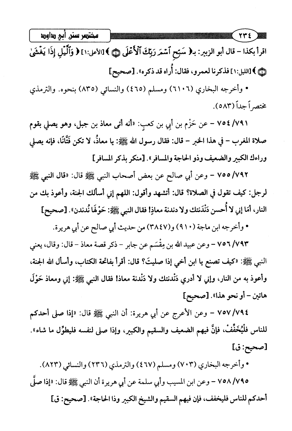 791/ 754 - عن حَزْم بن أبِي بن كعبٍ: "أنه أتى معاذ بن جبل، وهو يصلي بقوم صلاة المغرب -في هذا الخبر- قال: فقال رسول اللَّه -صلى اللَّه عليه وسلم-: يا معاذُ، لا تكن فَتَّانًا، فإنه يصلي وراءك الكبير والضعيف وذو الحاجة والمسافر".hمنكر بذكر المسافر]
