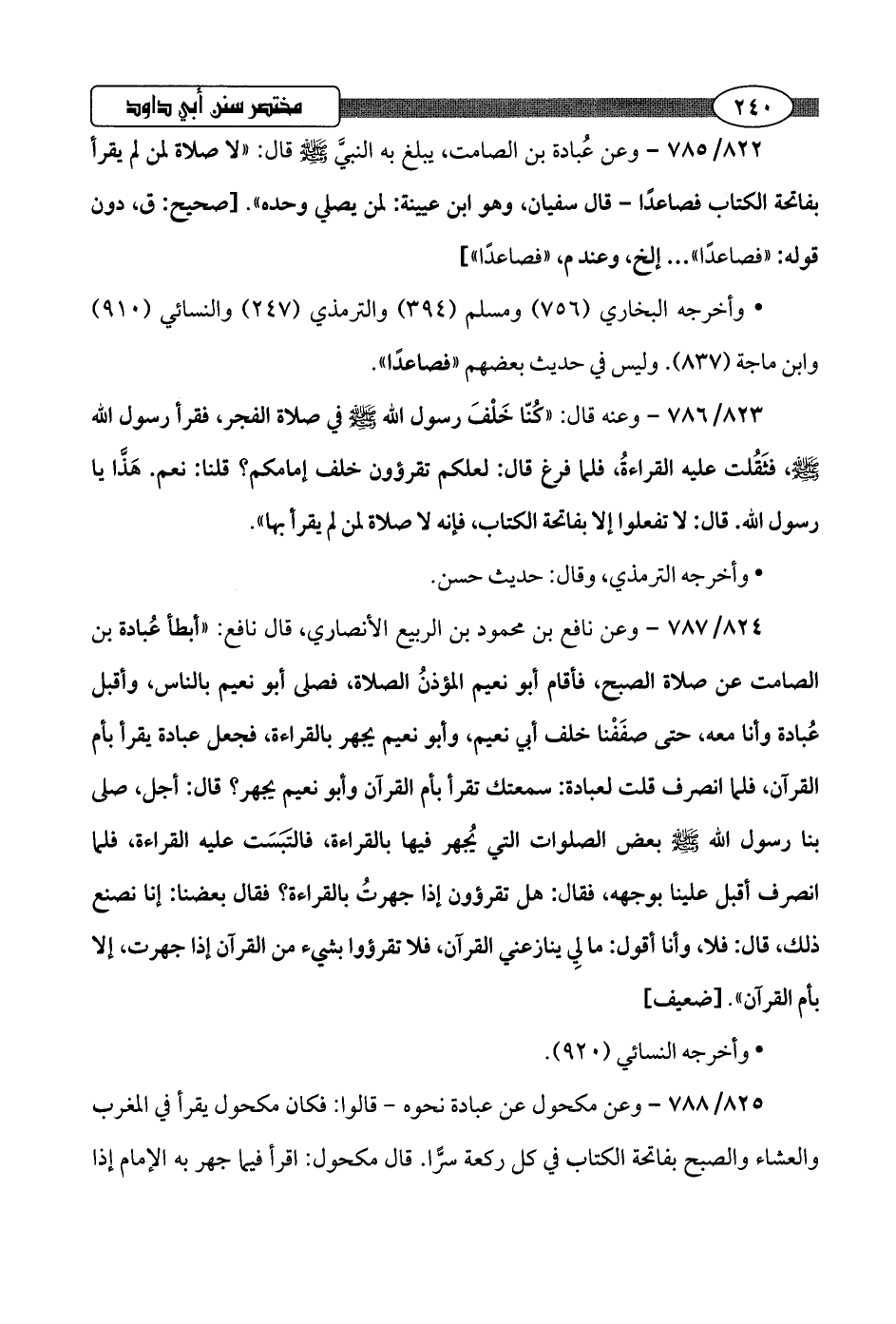 824/ 787 - وعن نافع بن محمود بن الربيع الأنصاري، قال نافع: "أبطأ عُبادة بن الصامت عن صلاة الصبح، فأقام أبو نعيم المؤذنُ الصلاة، فصلى أبو نعيم بالناس، وأقبل عُبادة وأنا معه، حتى صفَفْنا خلف أبي نعيم، وأبو نعيم يجهر بالقراءة، فجعل عبادة يقرأ بأم القرآن، فلما انصرف قلت لعبادة: سمعتك تقرأ بأم القرآن وأبو نعيم يجهر؟ قال: أجل، صلى بنا رسول اللَّه -صلى اللَّه عليه وسلم- بعض الصلوات التي يُجهر فيها بالقراءة، فالتبَسَت عليه القراءة، فلما انصرف أقبل علينا بوجهه، فقال: هل تقرؤون إذا جهرتُ بالقراءة؟ فقال بعضنا: إنا نصنع ذلك، قال: فلا، وأنا أقول: ما لِي ينازعني القرآن، فلا تقرؤوا بشيء من القرآن إذا جهرت، إلا بأم القرآن".hضعيف]