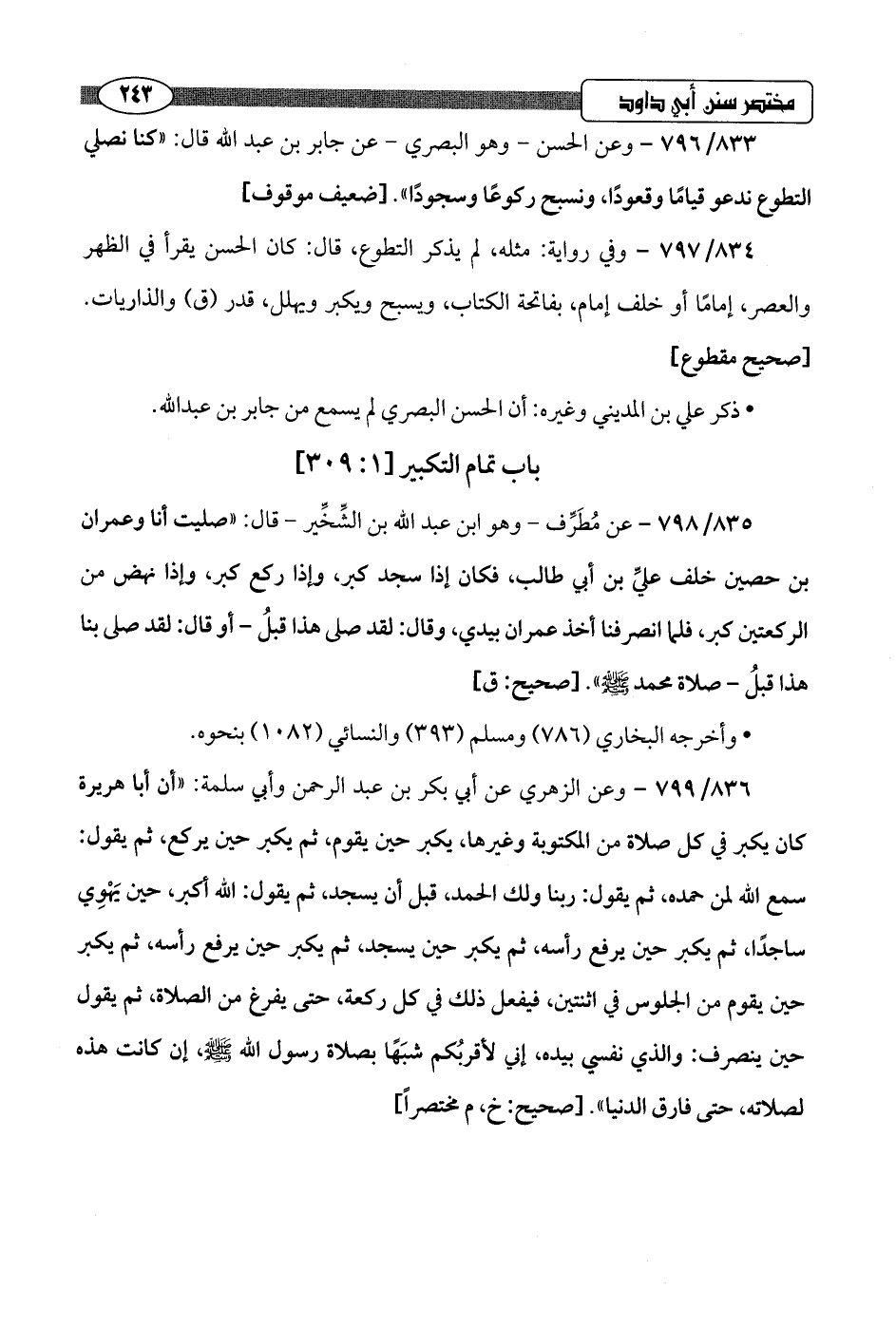835/ 798 - عن مُطَرِّف -وهو ابن عبد اللَّه بن الشِّخِّير- قال: "صليت أنا وعمران بن حصين خلف عليِّ بن أبي طالب، فكان إذا سجد كبر، وإذا ركع كبر، وإذا نهض من الركعتين كبر، فلما انصرفنا أخذ عمران بيدي، وقال: لقد صلى هذا قبلُ -أو قال: لقد صلى بنا هذا قبلُ- صلاة محمد -صلى اللَّه عليه وسلم-".hصحيح: ق]