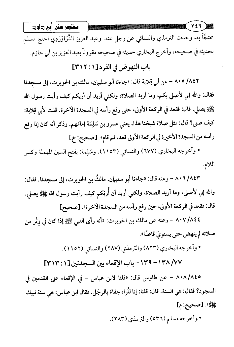 842/ 805 - عن أبي قِلابة قال: "جاءنا أبو سليمان، مالك بن الحويرث، إلى مسجدنا فقال: واللَّه إني لأصلي بكم، وما أريد الصلاة، ولكني أريد أن أريكم كيف رأيت رسول اللَّه -صلى اللَّه عليه وسلم- يصلي. قال: فقعد في الركعة الأولى، حتى رفع رأسه في السجدة الآخرة. قلت لأبي قِلابة: كيف صلى؟ قال: مثل صلاة شيخنا هذا، يعني عمرو بن سَلِمَة إمامَهم. وذكر أنه كان إذا رفع رأسه من السجدة الأخيرة في الركعة الأولى قعد، ثم قام".hصحيح: خ]