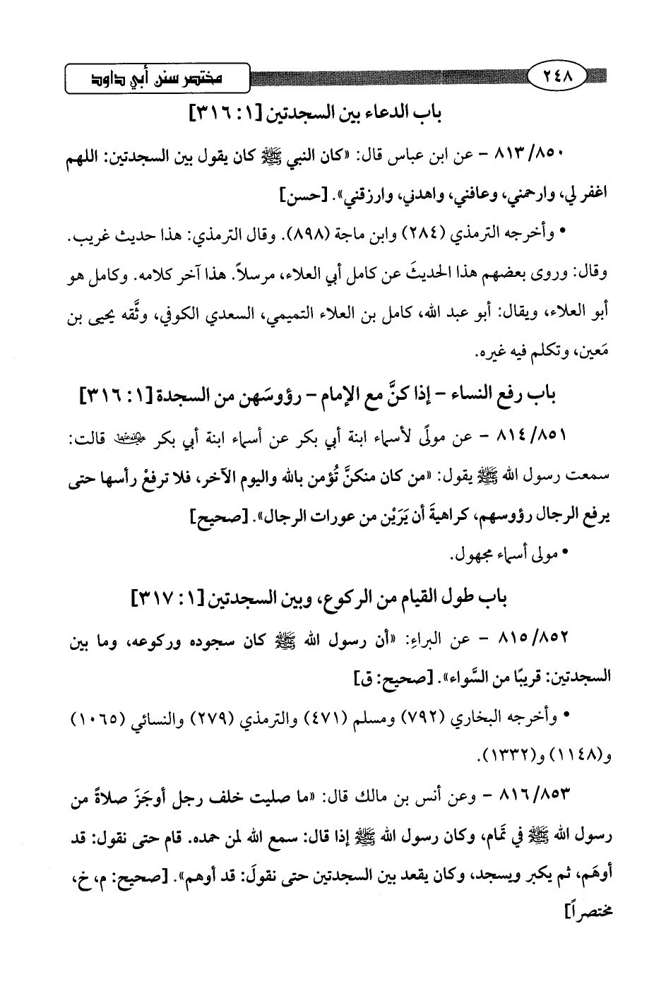 850/ 813 - عن ابن عباس قال: "كان النبي -صلى اللَّه عليه وسلم- كان يقول بين السجدتين: اللهم اغفر لي، وارحمني، وعافني، واهدني، وارزقني".hحسن]