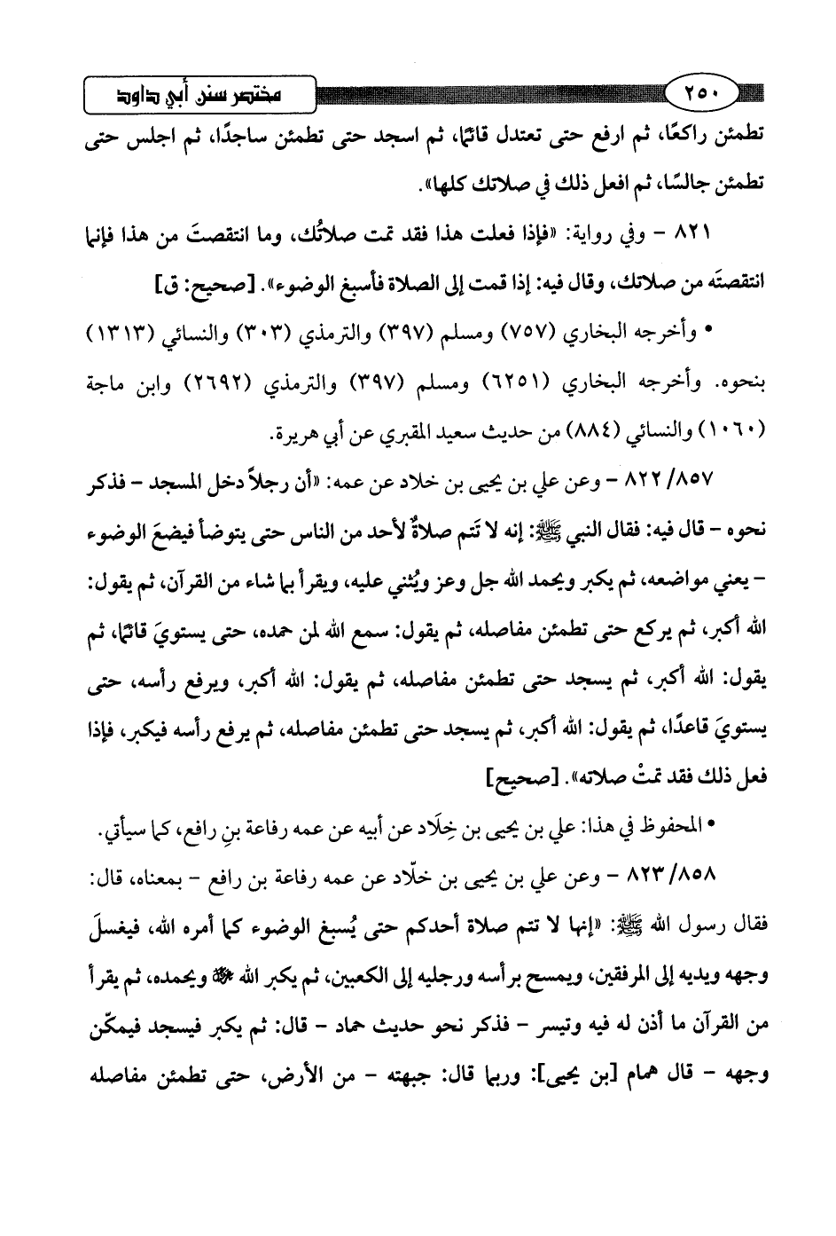 857/ 822 - وعن علي بن يحيى بن خلاد عن عمه: "أن رجلًا دخل المسجد -فذكر نحوه- قال فيه: فقال النبي -صلى اللَّه عليه وسلم-: إنه لا تَتم صلاةٌ لأحد من الناس حتى يتوضأ فيضعَ الوضوء -يعني مواضعه، ثم يكبر ويحمد اللَّه جل وعز وُيثني عليه، ويقرأ بما شاء من القرآن، ثم يقول: اللَّه أكبر، ثم يركع حتى تطمئن مفاصله، ثم يقول: سمع اللَّه لمن حمده، حتى يستويَ قائمًا، ثم يقول: اللَّه أكبر، ثم يسجد حتى تطمئن مفاصله، ثم يقول: اللَّه أكبر، ويرفع رأسه، حتى يستويَ قاعدًا، ثم يقول: اللَّه أكبر، ثم يسجد حتى تطمئن مفاصله، ثم يرفع رأسه فيكبر، فإذا فعل ذلك فقد تمتْ صلاته".hصحيح]