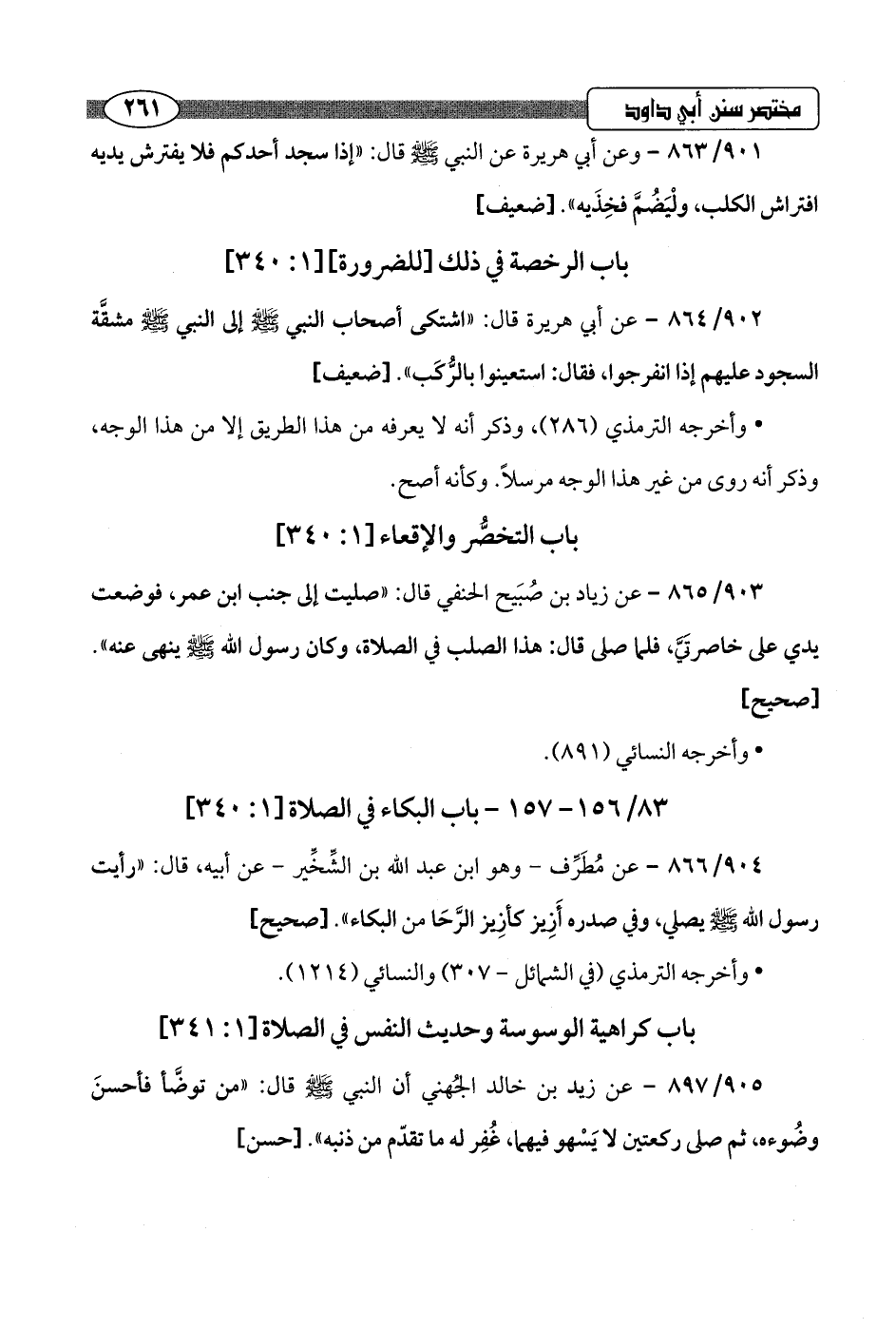 904/ 866 - عن مُطَرِّف -وهو ابن عبد اللَّه بن الشِّخِّير- عن أبيه، قال: "رأيت رسول اللَّه -صلى اللَّه عليه وسلم- يصلي، وفي صدره أَزِيز كأزِيز الرَّحَا من البكاء".hصحيح]