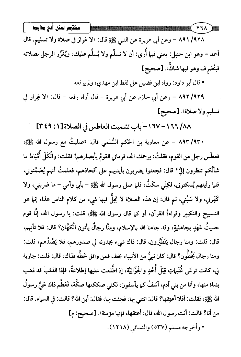 928/ 891 - وعن أبي هريرة عن النبي -صلى اللَّه عليه وسلم- قال: "لا غرارَ في صلاة ولا تسليم. قال أحمد -وهو ابن حنبل: يعني فيما أُرى: أن لا تسلِّم ولا يُسلَّم عليك، وُيغَرِّر الرجل بصلاته فينْصَرِف وهو فيها شاكٌّ".hصحيح]