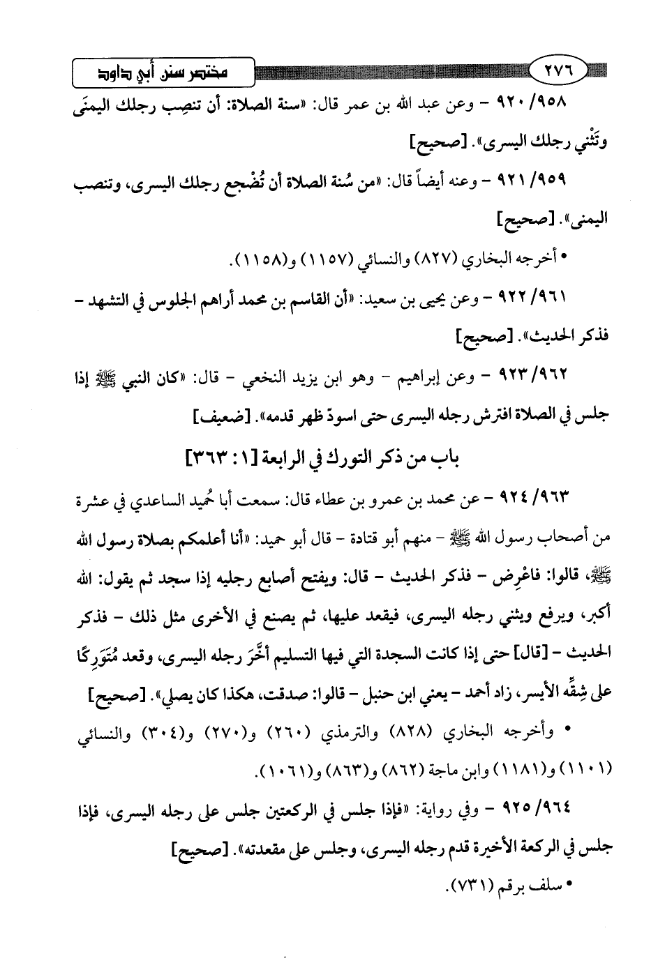 964/ 925 - وفي رواية: "فإذا جلس في الركعتين جلس على رجله اليسرى، فإذا جلس في الركعة الأخيرة قدم رجله اليسرى، وجلس على مقعدته".hصحيح]