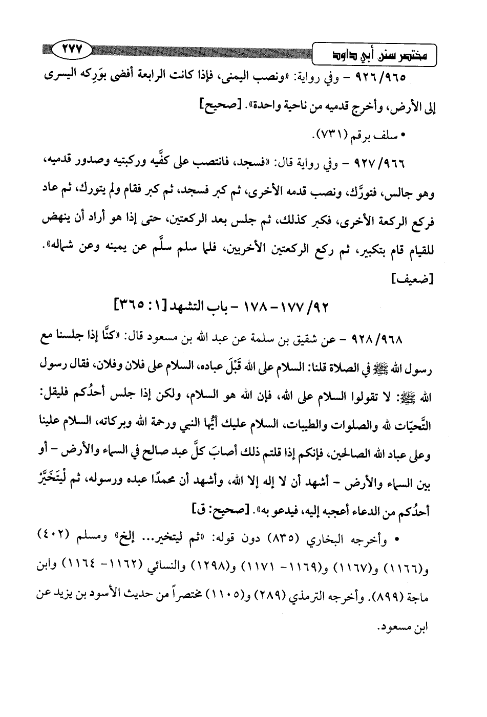 968/ 928 - عن شقيق بن سلمة عن عبد اللَّه بن مسعود قال: "كنَّا إذا جلسنا مع رسول اللَّه -صلى اللَّه عليه وسلم- في الصلاة قلنا: السلام على اللَّه قَبْلَ عباده، السلام على فلان وفلان، فقال رسول اللَّه -صلى اللَّه عليه وسلم-: لا تقولوا السلام على اللَّه، فإن اللَّه هو السلام، ولكن إذا جلس أحدُكم فليقل: التَّحيّات للَّه والصلوات والطيبات، السلام عليك أيُّها النبي ورحمة اللَّه وبركاته، السلام علينا وعلى عباد اللَّه الصالحين، فإنكم إذا قلتم ذلك أصابَ كلَّ عبد صالح في السماء والأرض -أو بين السماء والأرض- أشهد أن لا إله إلا اللَّه، وأشهد أن محمدًا عبده ورسوله، ثم لْيتَخَيَّرْ أحدُكم من الدعاء أعجبه إليه، فيدعو به".hصحيح: ق]
