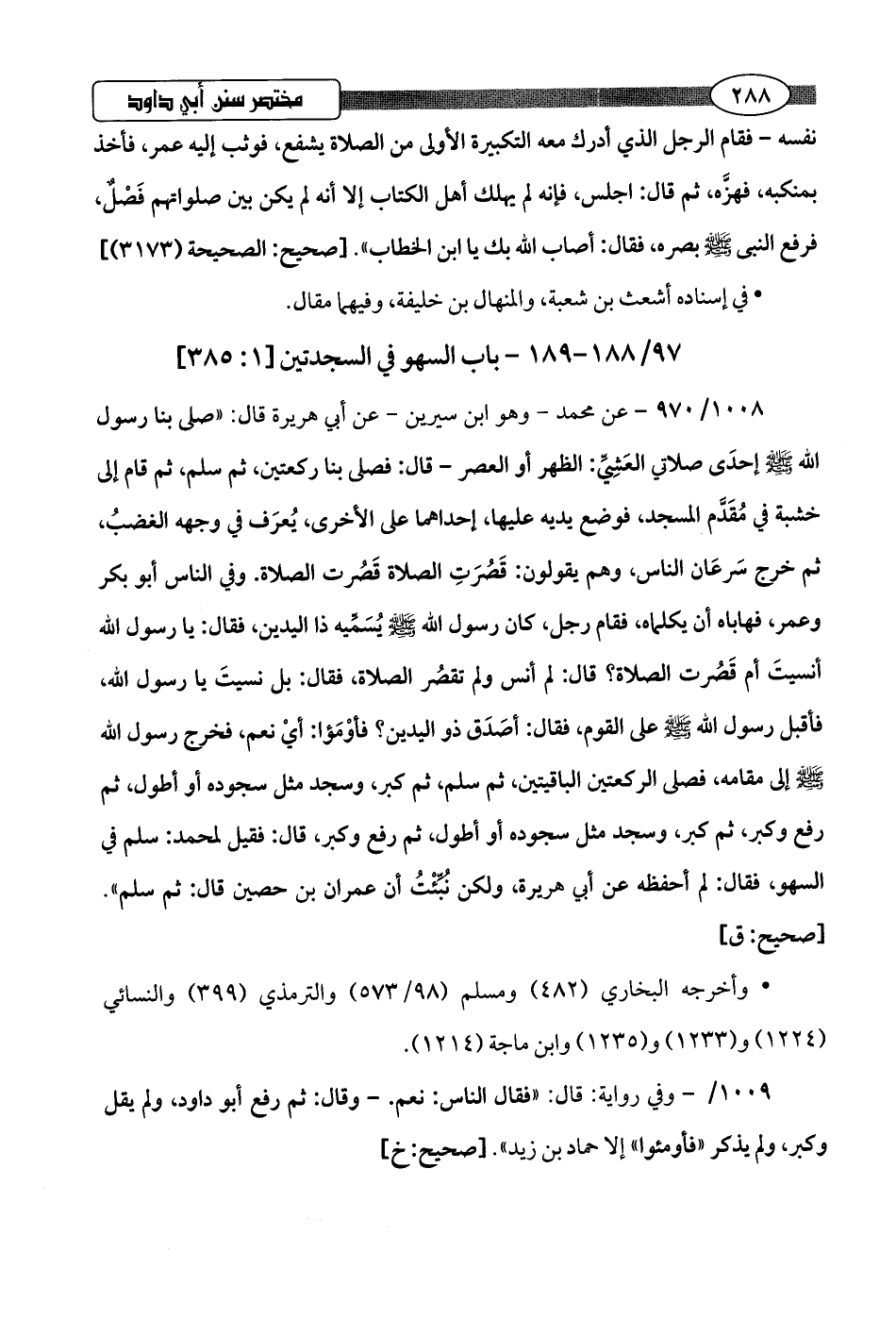 1008/ 970 - عن محمد -وهو ابن سيرين- عن أبي هريرة قال: "صلى بنا رسول اللَّه -صلى اللَّه عليه وسلم- إحدَى صلاتي العَشِيِّ: الظهر أو العصر- قال: فصلى بنا ركعتين، ثم سلم، ثم قام إلى خشبة في مُقَدَّم المسجد، فوضع يديه عليها، إحداهما على الأخرى، يُعرَف في وجهه الغضبُ، ثم خرج سَرعَان الناس، وهم يقولون: قَصُرَتِ الصلاة قَصُرت الصلاة. وفي الناس أبو بكر وعمر، فهاباه أن يكلماه، فقام رجل، كان رسول اللَّه -صلى اللَّه عليه وسلم- يُسَمِّيه ذا اليدين، فقال: يا رسول اللَّه أنسيتَ أم قَصُرت الصلاة؟ قال: لم أنس ولم تقصُر الصلاة، فقال: بل نسيتَ يا رسول اللَّه، فأقبل رسول اللَّه -صلى اللَّه عليه وسلم- على القوم، فقال: أصَدَق ذو اليدين؟ فأوْمَؤا: أيْ نعم، فخرج رسول اللَّه -صلى اللَّه عليه وسلم- إلى مقامه، فصلى الركعتين الباقيتين، ثم سلم، ثم كبر، وسجد مثل سجوده أو أطول، ثم رفع وكبر، ثم كبر، وسجد مثل سجوده أو أطول، ثم رفع وكبر، قال: فقيل لمحمد: سلم في السهو، فقال: لم أحفظه عن أبي هريرة، ولكن نُبِّئْتُ أن عمران بن حصين قال: ثم سلم".hصحيح: ق]