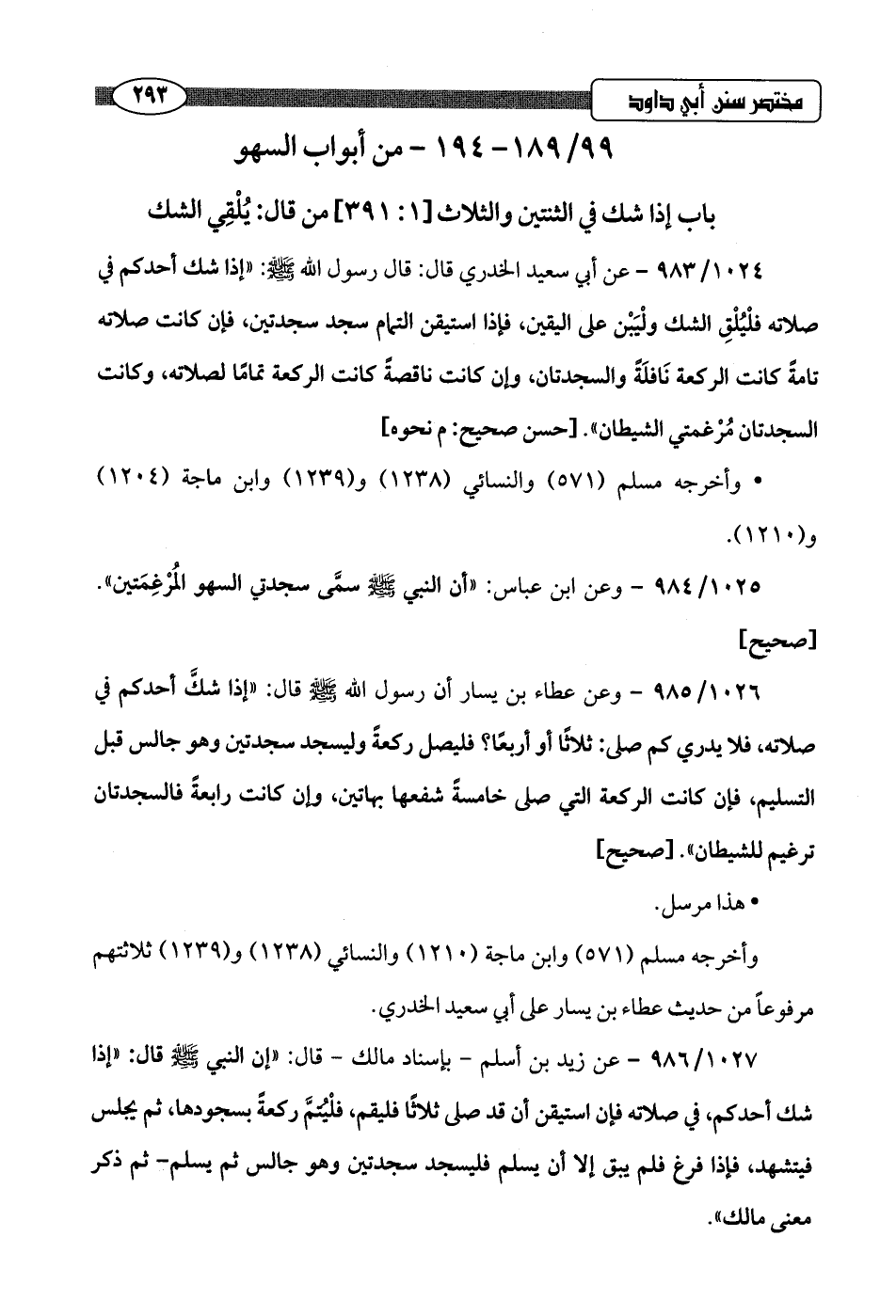 1024/ 983 - عن أبي سعيد الخدري قال: قال رسول اللَّه -صلى اللَّه عليه وسلم-: "إذا شك أحدكم في صلاته فلْيُلْقِ الشك ولْيَبْن على اليقين، فإذا استيقن التمام سجد سجدتين، فإن كانت صلاته تامةً كانت الركعة نَافلَةً والسجدتان، وإن كانت ناقصةً كانت الركعة تمامًا لصلاته، وكانت السجدتان مُرْغمتي الشيطان".hحسن صحيح: م نحوه]