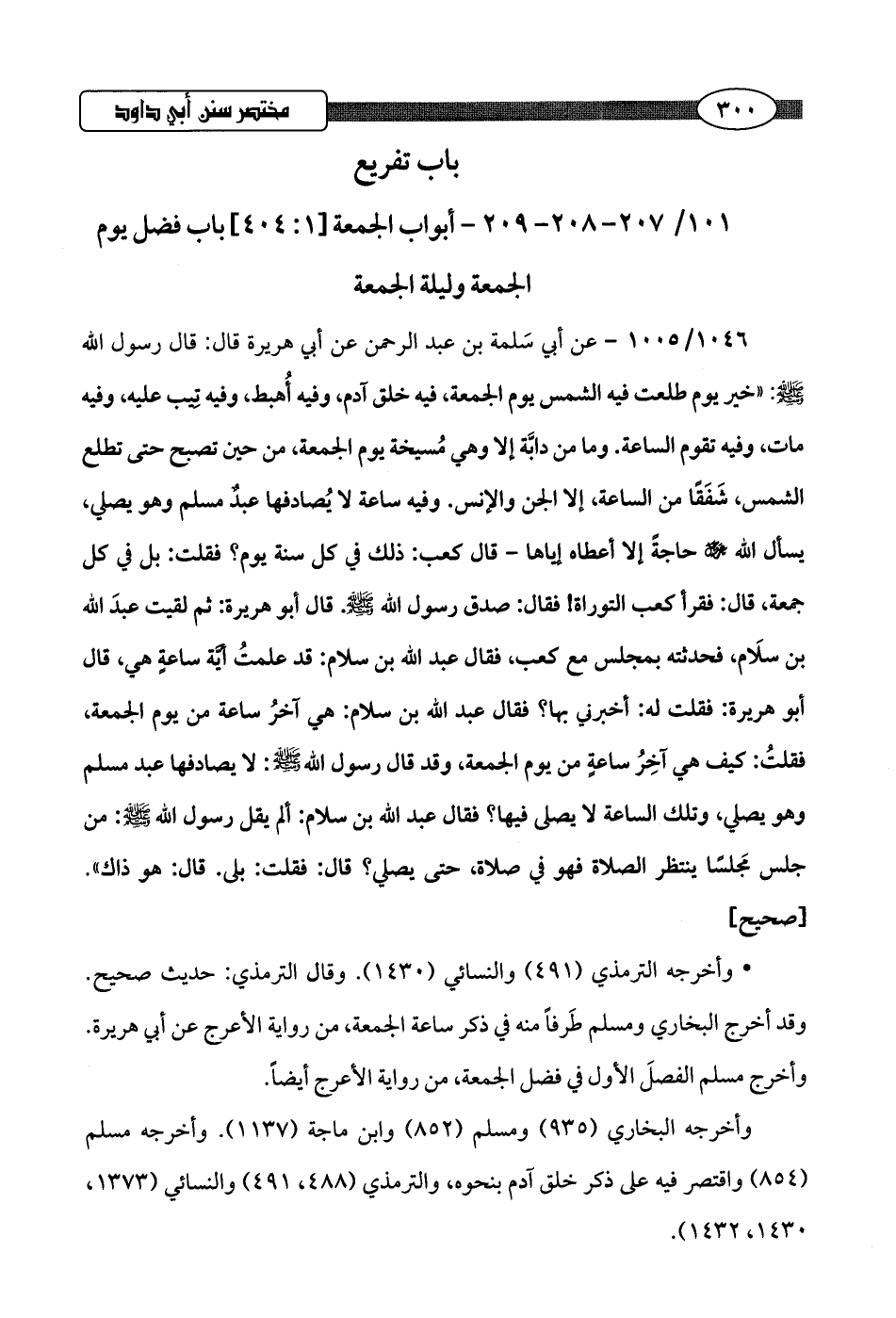 1046/ 1005 - عن أبي سَلمة بن عبد الرحمن عن أبي هريرة قال: قال رسول اللَّه -صلى اللَّه عليه وسلم-: "خير يوم طلعت فيه الشمس يوم الجمعة، فيه خلق آدم، وفيه أُهبط، وفيه تِيب عليه، وفيه مات، وفيه تقوم الساعة. وما من دابَّة إلا وهي مُسيخة يوم الجمعة، من حين تصبح حتى تطلع الشمس، شَفَقًا من الساعة، إلا الجن والأنس. وفيه ساعة لا يُصادفها عبدٌ مسلم وهو يصلي، يسأل اللَّه عز وجل حاجةً إلا أعطاه إياها -قال كعب: ذلك في كل سنة يوم؟ فقلت: بل في كل جمعة، قال: فقرأ كعب التوراة! فقال: صدق رسول اللَّه -صلى اللَّه عليه وسلم-. قال أبو هريرة: ثم لقيت عبدَ اللَّه بن سلَام، فحدثته بمجلس مع كعب، فقال عبد اللَّه بن سلام: قد علمتُ أيَّة ساعةٍ هي، قال أبو هريرة: فقلت له: أخبرني بها؟ فقال عبد اللَّه بن سلام: هي آخرُ ساعة من يوم الجمعة، فقلتُ: كيف هي آخِرُ ساعةٍ من يوم الجمعة، وقد قال رسول اللَّه -صلى اللَّه عليه وسلم-: لا يصادفها عبد مسلم وهو يصلي، وتلك الساعة لا يصلى فيها؟ فقال عبد اللَّه بن سلام: ألم يقل رسول اللَّه -صلى اللَّه عليه وسلم-: من جلس مَجلسًا ينتظر الصلاة فهو في صلاة، حتى يصلي؟ قال: فقلت: بلى. قال: هو ذاك".hصحيح]