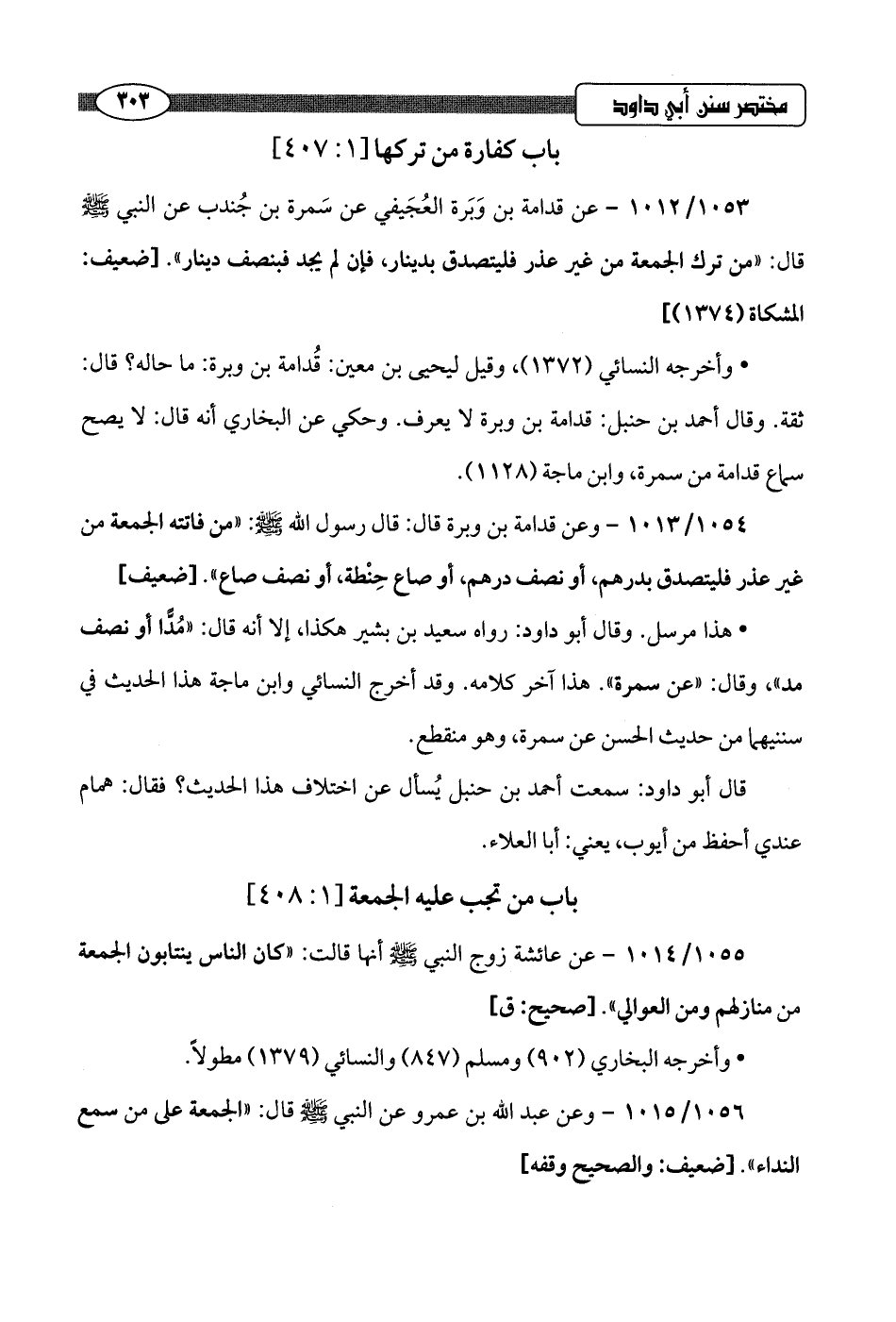 1054/ 1013 - وعن قدامة بن وبرة قال: قال رسول اللَّه -صلى اللَّه عليه وسلم-: "من فاتته الجمعة من غير عذر فليتصدق بدرهم، أو نصف درهم، أو صاع حِنْطة، أو نصف صاع".hضعيف]