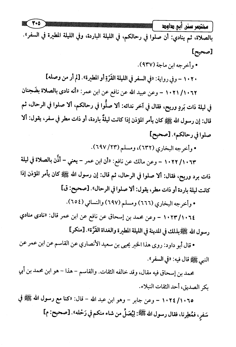 1062/ 1021 - وعن عبيد اللَّه عن نافع عن ابن عمر: "أنه نادى بالصلاة بضَجنان في ليلة ذات بَردٍ وريح، فقال في آخر ندائه: ألا صلُّوا في رحالكم، ألا صلوا في الرحال، ثم قال: إن رسول اللَّه -صلى اللَّه عليه وسلم- كان يأمر المؤذن إذا كانت ليلة باردة، أو ذات مطر في سفر، يقول: ألا صلوا في رحالكم".hصحيح]