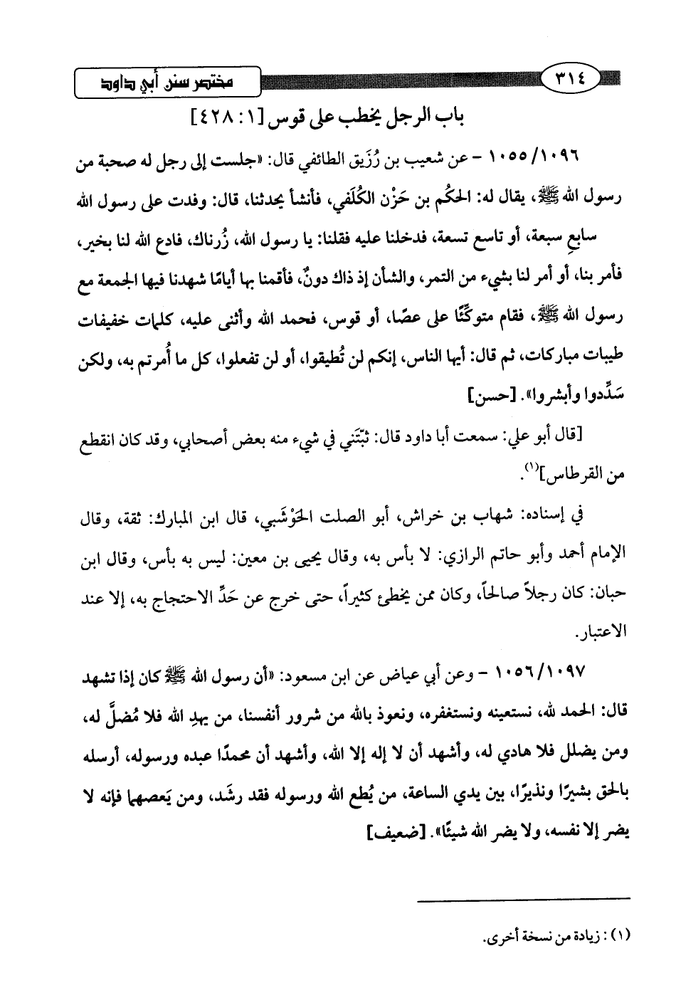 1096/ 1055 - عن شعيب بن رُزَيق الطائفي قال: "جلست إلى رجل له صحبة من رسول اللَّه -صلى اللَّه عليه وسلم-، يقال له: الحكُم بن حَزْن الكُلَفي، فانشأ يحدثنا، قال: وفدت على رسول اللَّه سابعِ سبعة، أو تاسع تسعة، فدخلنا عليه فقلنا: يا رسول اللَّه، زُرناك، فادع اللَّه لنا بخير، فأمر بنا، أو أمر لنا بشيء من التمر، والشأن إذ ذاك دون، فأقمنا بها أيامًا شهدنا فيها الجمعة مع رسول اللَّه -صلى اللَّه عليه وسلم-، فقام متوكِّئًا على عصًا، أو قوس، فحمد اللَّه وأثنى عليه، كلمات خفيفات طيبات مباركات، ثم قال: أيها الناس، إنكم لن تُطيقوا، أو لن تفعلوا، كل ما أُمرتم به، ولكن سَدّدوا وأبشروا".hحسن]
