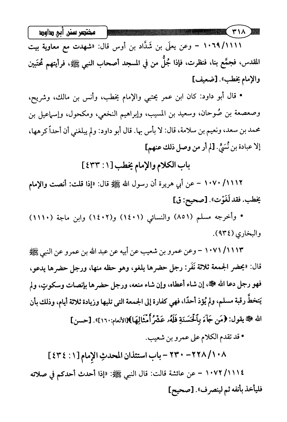 1111/ 1069 - وعن يعلَى بن شَدَّاد بن أوس قال: "شهدت مع معاوية بيت المقدس، فجمَّع بنا، فنظرت، فإذا جُلُّ من في المسجد أصحاب النبي -صلى اللَّه عليه وسلم-، فرأيتهم مُحتَبين والإمام يخطب".hضعيف]