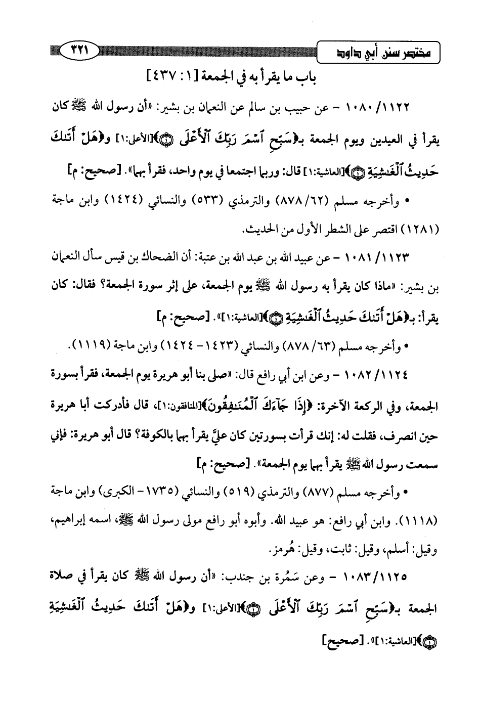 1125/ 1083 - وعن سَمُرة بن جندب: "أن رسول اللَّه -صلى اللَّه عليه وسلم- كان يقرأ في صلاة الجمعة بـ {سَبِّحِ اسْمَ رَبِّكَ الْأَعْلَى (1)} [الأعلى: 1]، و {هَلْ أَتَاكَ حَدِيثُ الْغَاشِيَةِ (1)} [الغاشية: 1] hصحيح]