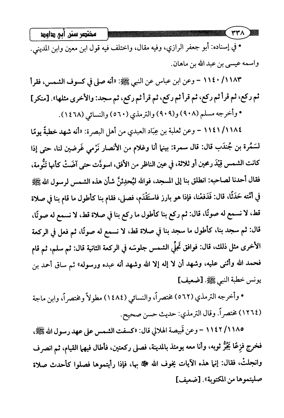 1184/ 1141 - وعن ثعلبة بن عِبَاد العبدي من أهل البصرة: "أنه شهد خطبةً يومًا لسَمُرة بن جُندَب قال: قال سمرة: بينما أنا وكلام من الأنصار نَرْمي غَرضين لنا، حتى إذا كانت الشمس قِيْدَ رمحين أو ثلاثة، في عين الناظر من الأفق، اسودَّت حتى آضَتْ كأنها تَنُّومة، فقال أحدنا لصاحبه: انطلق بنا إلى المسجد، فواللَّه ليُحدِثنَّ شأن هذه الشمس لرسول اللَّه -صلى اللَّه عليه وسلم- في أمَّته حَدَثًا، قال: فَدَفعْنا، فإذا هو بارز فاستَقْدَم، فصلى، فقام بنا كأطول ما قام بنا في صلاة قط، لا نسمع له صوتًا، قال: ثم ركع بنا كأطول ما ركع بنا في صلاة قط، لا نسمع له صوتًا، قال: ثم سجد بنا، كأطول ما سجد بنا في صلاة قط، لا نسمع له صوتًا، ثم فعل في الركعة الأخرى مثل ذلك، قال: فوافق تَجلِّي الشمس جلوسَه في الركعة الثانية قال: ثم سلم، ثم قام فحمد اللَّه وأثنى عليه، وشهد أن لا إله إلا اللَّه وشهد أنه عبده ورسوله" ثم ساق أحمد بن يونس خطبة النبي -صلى اللَّه عليه وسلم-.hضعيف]