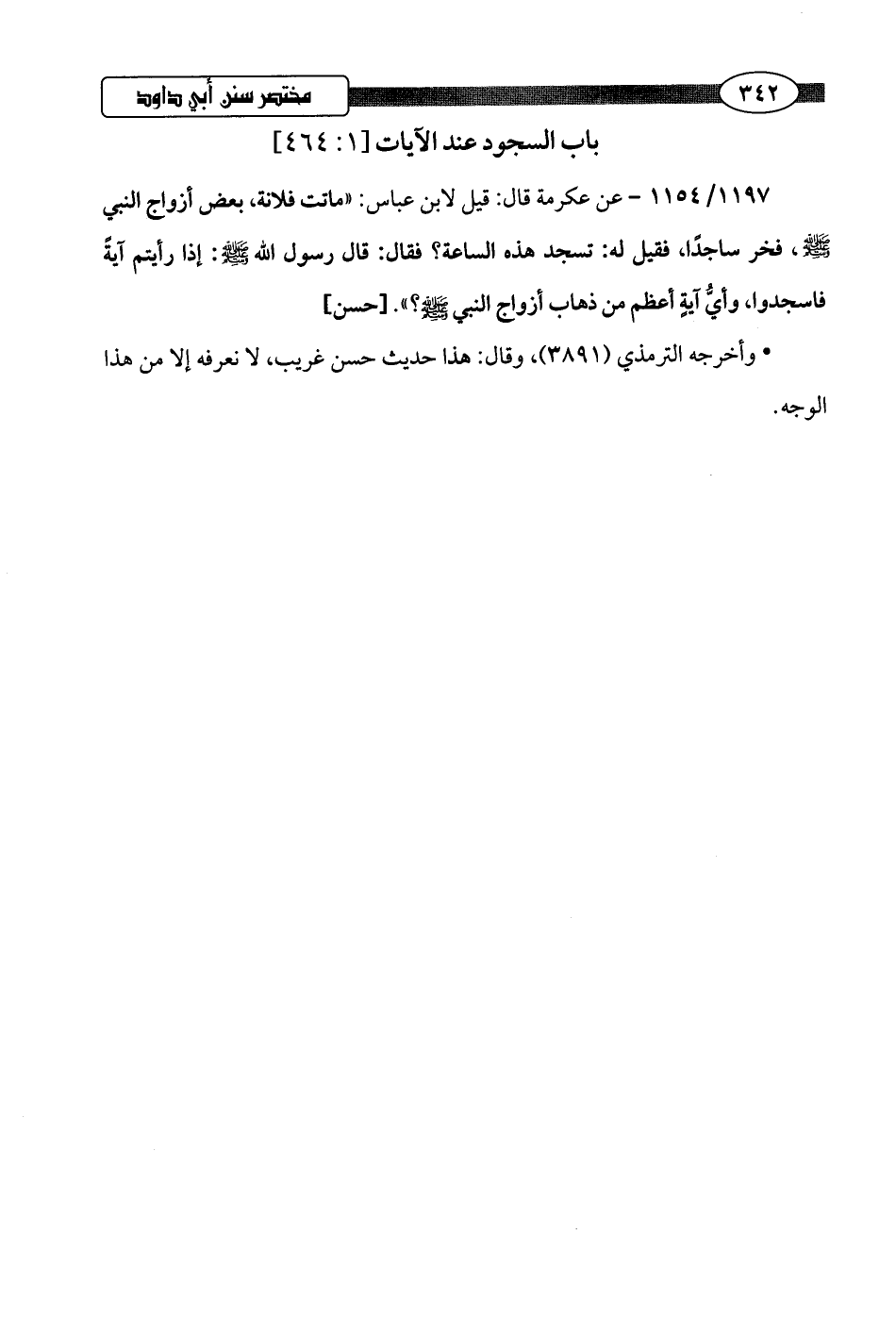 1197/ 1154 - عن عكرمة قال: قيل لابن عباس: "ماتت فلانة، بعض أزواج النبي -صلى اللَّه عليه وسلم-، فخر ساجدًا، فقيل له: تسجد هذه الساعة؟ فقال: قال رسول اللَّه -صلى اللَّه عليه وسلم-: إذا رأيتم آية فاسجدوا، وأيُّ آية أعظم من ذهاب أزواج النبي -صلى اللَّه عليه وسلم-؟ ".hحسن]