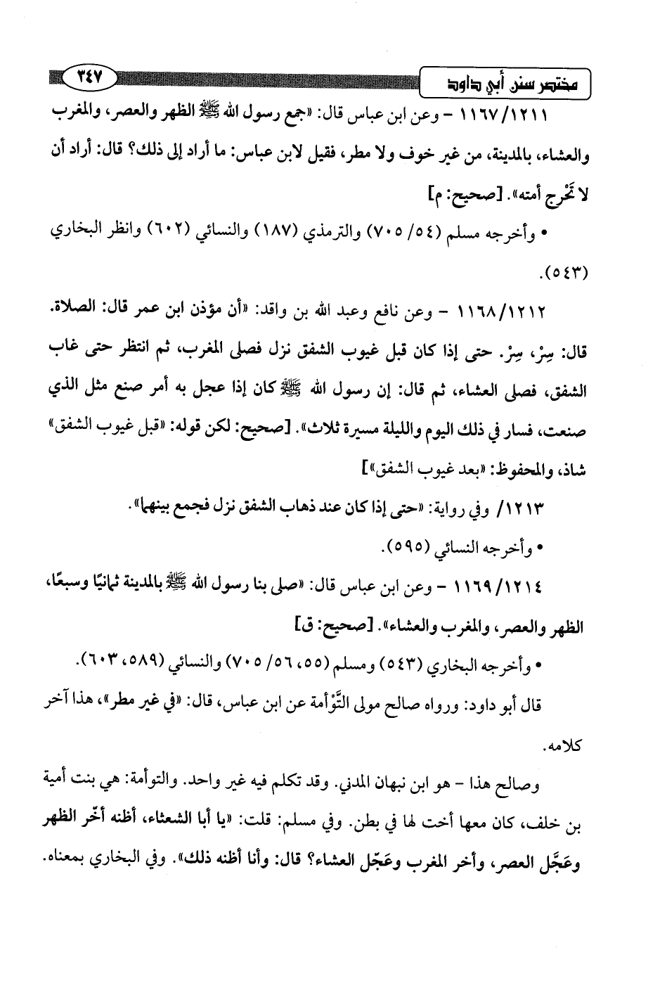 1211/ 1167 - وعن ابن عباس قال: "جمع رسول اللَّه -صلى اللَّه عليه وسلم- الظهر والعصر، والمغرب والعشاء، بالمدينة، من غير خوف ولا مطر، فقيل لابن عباس: ما أراد إلى ذلك؟ قال: أراد أن لا تَحْرج أمته".hصحيح: م]
