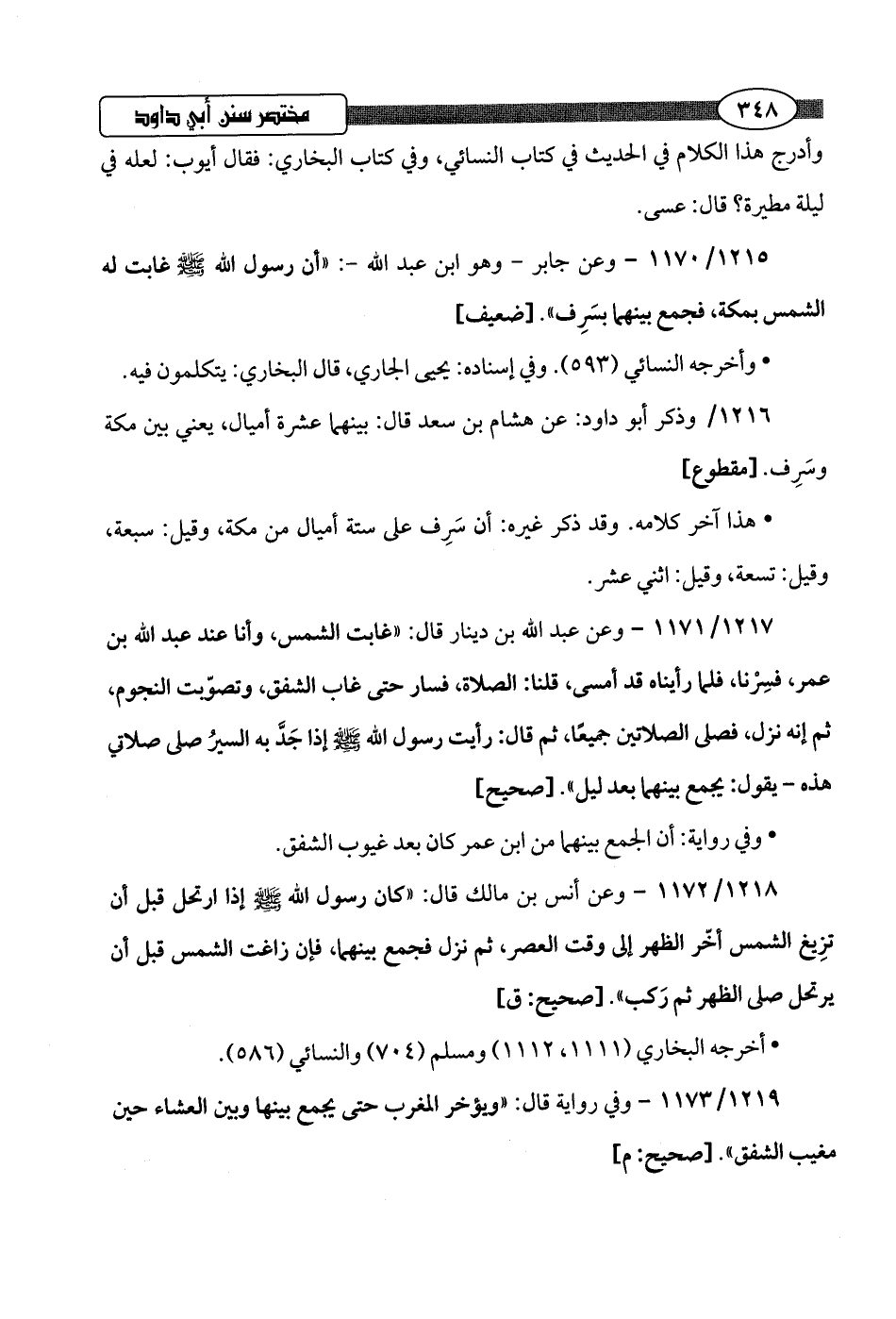 1215/ 1170 - وعن جابر -وهو ابن عبد اللَّه-: "أن رسول اللَّه -صلى اللَّه عليه وسلم- غابت له الشمس بمكة، فجمع بينهما بسَرِف".hضعيف]