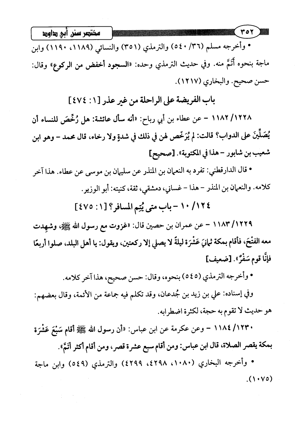 1229/ 1183 - عن عمران بن حصين قال: "غزوت مع رسول اللَّه -صلى اللَّه عليه وسلم-، وشهِدت معه الفتْحَ، فأقام بمكة ثمانيَ عَشْرَة ليلةً لا يصلي إلا ركعتين، ويقول: يَا أهل البلد، صلوا أربعًا فإنَّا قوم سَفْرٌ".hضعيف]