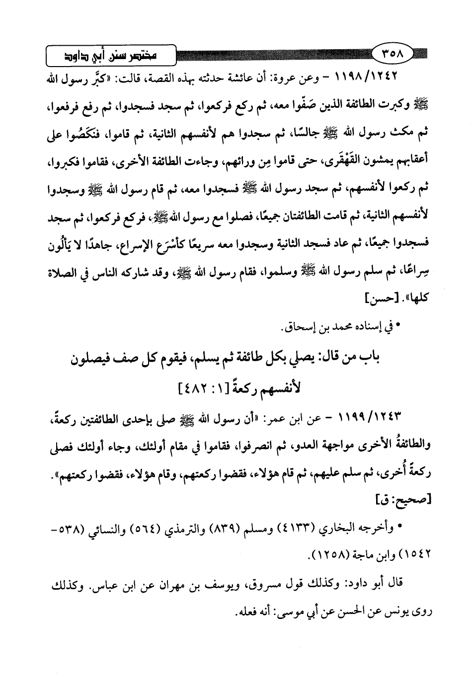 1242/ 1198 - وعن عروة: أن عائشة حدثته بهذه القصة، قالت: "كبَّر رسول اللَّه -صلى اللَّه عليه وسلم- وكبرت الطائفة الذين صَفّوا معه، ثم ركع فركعوا، ثم سجد فسجدوا، ثم رفع فرفعوا، ثم مكث رسول اللَّه -صلى اللَّه عليه وسلم- جالسًا، ثم سجدوا هم لأنفسهم الثانية، ثم قاموا، فنكَصُوا على أعقابهم يمشون القَهْقَرى، حتى قاموا مِن ورائهم، وجاءت الطائفة الأخرى، فقاموا فكبروا، ثم ركعوا لأنفسهم، ثم سجد رسول اللَّه -صلى اللَّه عليه وسلم- فسجدوا معه، ثم قام رسول اللَّه -صلى اللَّه عليه وسلم- وسجدوا لأنفسهم الثانية، ثم قامت الطائفتان جميعًا، فصلوا مع رسول اللَّه -صلى اللَّه عليه وسلم-، فركع فركعوا، ثم سجد فسجدوا جميعًا، ثم عاد فسجد الثانية وسجدوا معه سريعًا كأسْرَع الإسراع، جاهدًا لا يَألُون سِراعًا، ثم سلم رسول اللَّه -صلى اللَّه عليه وسلم- وسلموا، فقام رسول اللَّه -صلى اللَّه عليه وسلم-، وقد شاركه الناس في الصلاة كلها".hحسن]