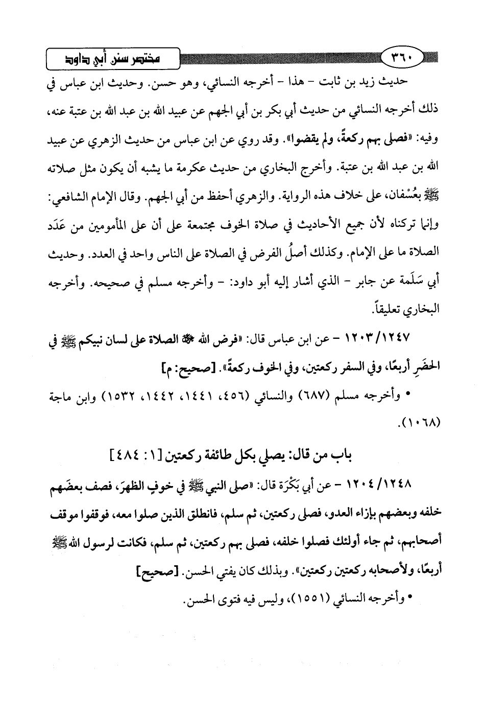 1248/ 1204 - عن أبي بَكْرَة قال: "صلى النبي -صلى اللَّه عليه وسلم- في خوفي الظهرَ، فصف بعضَهم خلفه وبعضهم بإزاء العدو، فصلى ركعتين، ثم سلم، فانطلق الذين صلوا معه، فوقفوا موقف أصحابهم، ثم جاء أولئك فصلوا خلفه، فصلى بهم ركعتين، ثم سلم، فكانت لرسول اللَّه -صلى اللَّه عليه وسلم- أربعًا, ولأصحابه ركعتين ركعتين". وبذلك كان يفتي الحسن.hصحيح]