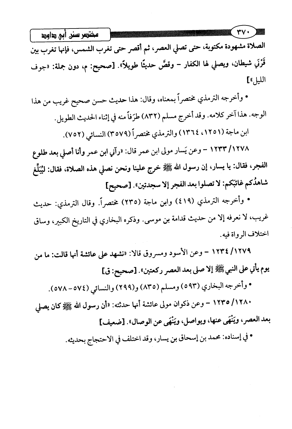 1280/ 1235 - وعن ذكوان مولى عائشة أنها حدثته: "أن رسول اللَّه -صلى اللَّه عليه وسلم- كان يصلي بعد العصر، ويَنْهَى عنها، ويواصل، ويَنْهَى عن الوصال".hضعيف]