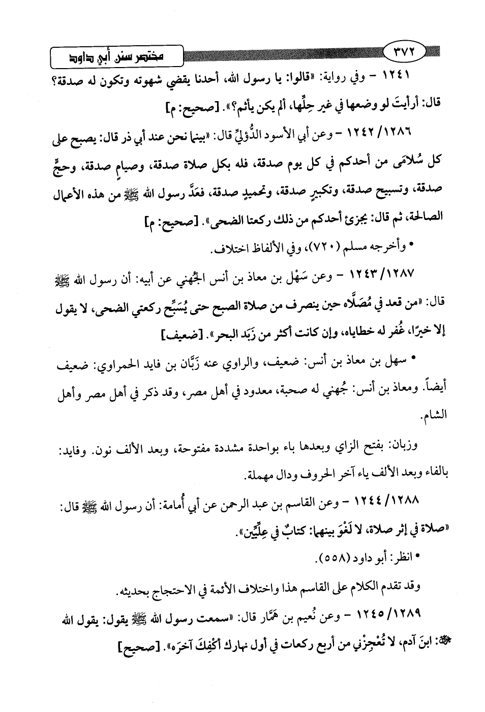 1286/ 1242 - وعن أبي الأسود الدُّؤليِّ قال: "بينما نحن عند أبي ذر قال: يصبح على كل سُلامَى من أحدكم في كل يوم صدقة، فله بكل صلاة صدقة، وصيامٍ صدقة، وحجٍّ صدقة، وتسبيح صدقة، وتكبيرٍ صدقة، وتحميدٍ صدقة، فعَدَّ رسول اللَّه -صلى اللَّه عليه وسلم- من هذه الأعمال الصالحة، ثم قال: يجزئ أحدكم من ذلك ركعتا الضحى".hصحيح: م]
