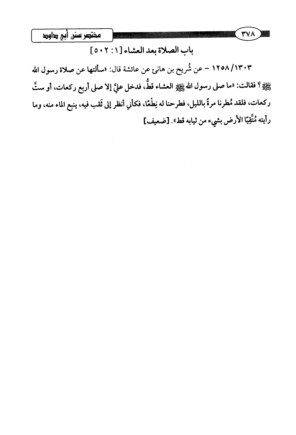 1303/ 1258 - عن شُريح بن هانئ عن عائشة قال: "سألتها عن صلاة رسول اللَّه -صلى اللَّه عليه وسلم-؟ فقالت: "ما صلى رسول اللَّه -صلى اللَّه عليه وسلم- العشاء قط، فدخل عليَّ إلا صلى أربع ركعات، أو ستَّ ركعات، فلقد مُطرنا مرةً بالليل، فطرحنا له نِطْعًا، فكأني انظر إلى ثَقب فيه، ينبع الماء منه، وما رأيته مُتَقِيًا الأرض بشيء من ثيابه قط".hضعيف]