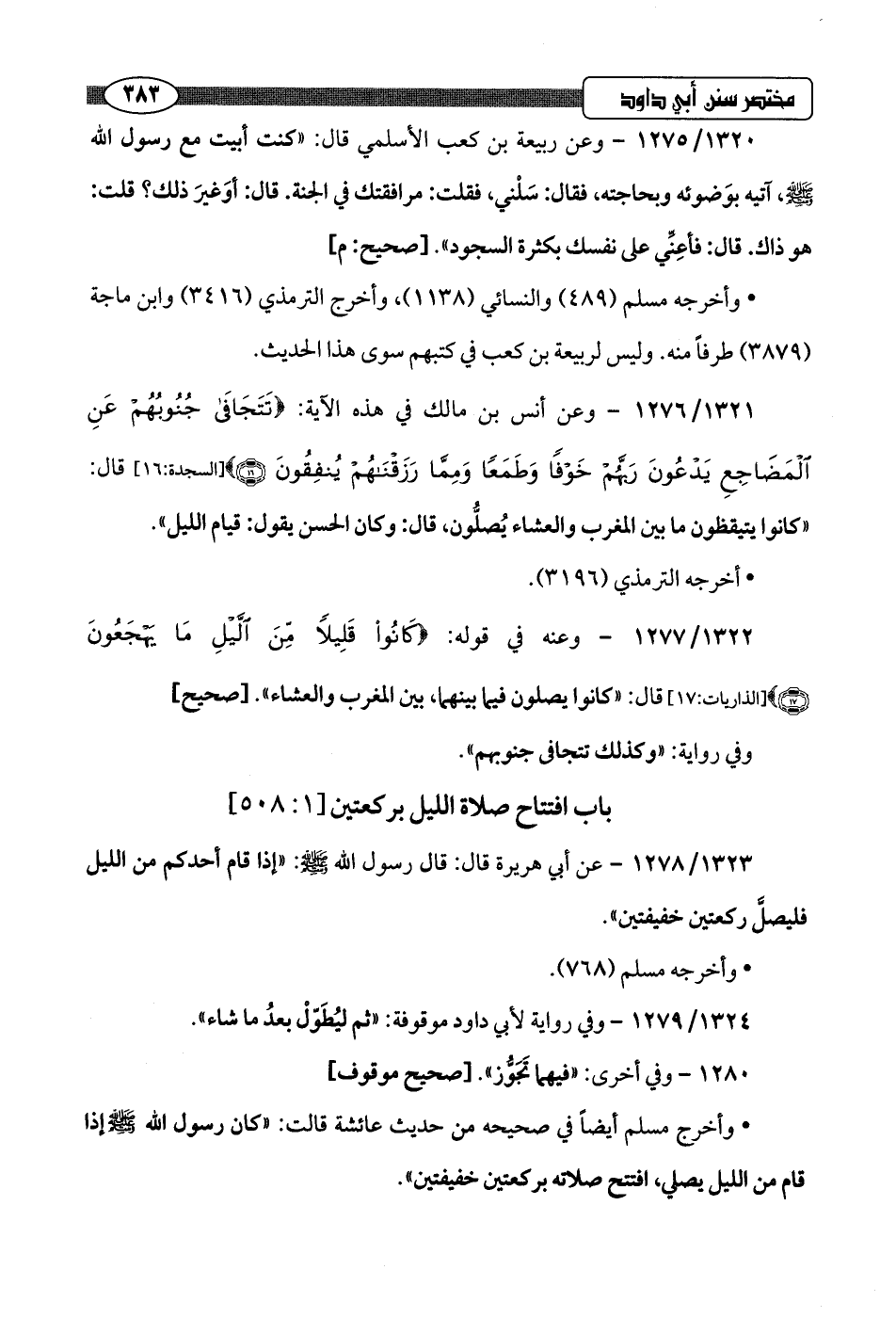 1321/ 1276 - وعن أنس بن مالك في هذه الآية: {تَتَجَافَى جُنُوبُهُمْ عَنِ الْمَضَاجِعِ يَدْعُونَ رَبَّهُمْ خَوْفًا وَطَمَعًا وَمِمَّا رَزَقْنَاهُمْ يُنْفِقُونَ (16)} [السجدة: 16] قال: "كانوا يتيقظون ما بين المغرب والعشاء يُصلُّون، قال: وكان الحسن يقول: قيام الليل".
