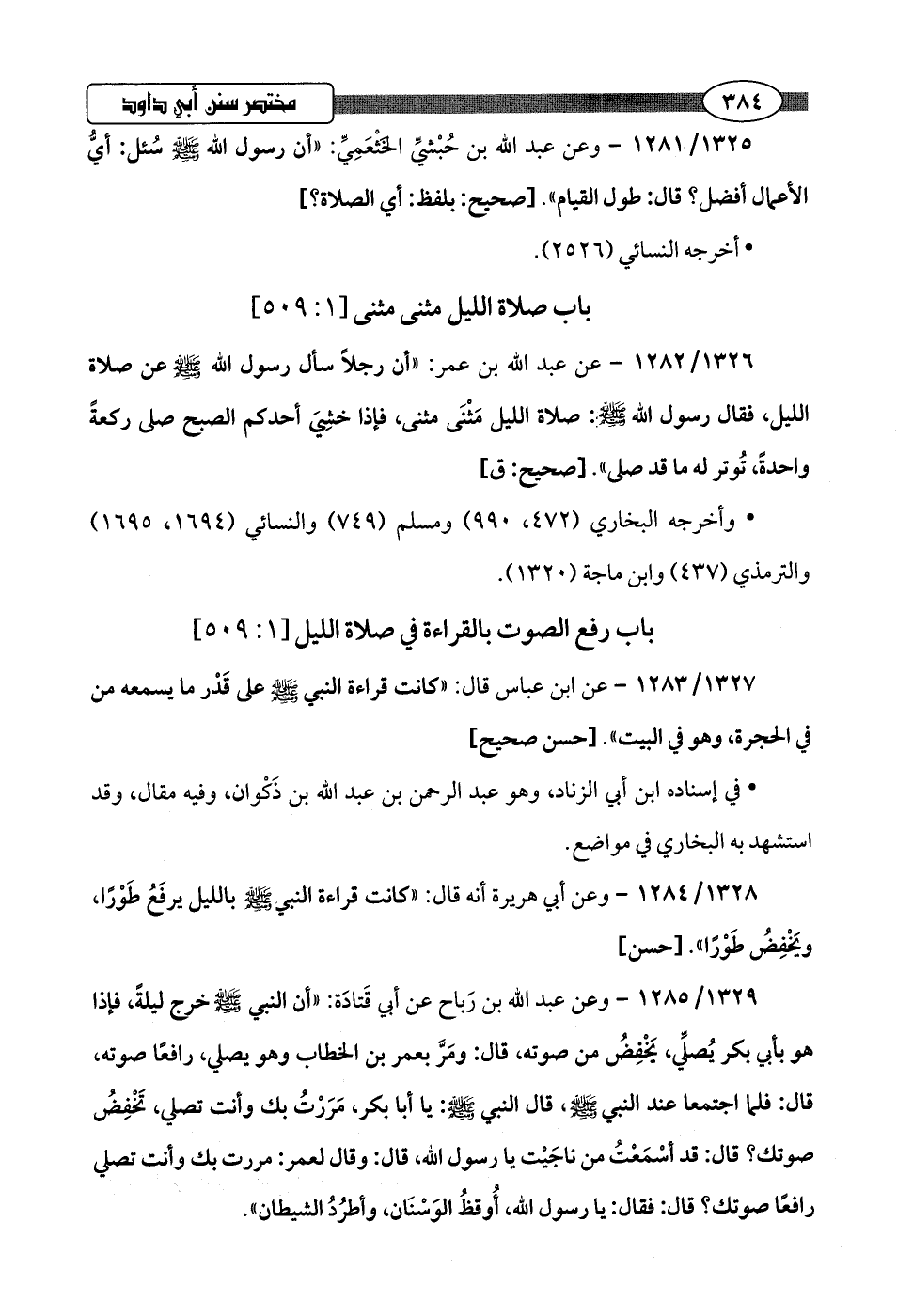 1329/ 1285 - وعن عبد اللَّه بن رَباح عن أبي قَتادَة: "أن النبي -صلى اللَّه عليه وسلم- خرج ليلةً، فإذا هو بأبي بكر يُصلِّي، يَخْفِضُ من صوته، قال: ومَرَّ بعمر بن الخطاب وهو يصلي، رافعًا صوته، قال: فلما اجتمعا عند النبي -صلى اللَّه عليه وسلم-، قال النبي -صلى اللَّه عليه وسلم-: يَا أَبا بكر، مَرَرْتُ بك وأنت تصلي، تَخْفِضُ صوتك؟ قال: قد أسْمَعْتُ من ناجَيْت يَا رسول اللَّه، قال: وقال لعمر: مررت بك وأنت تصلي رافعًا صوتك؟ قال: فقال: يَا رسول اللَّه، أُوقظُ الوَسْنَان، وأطرُدُ الشيطان".