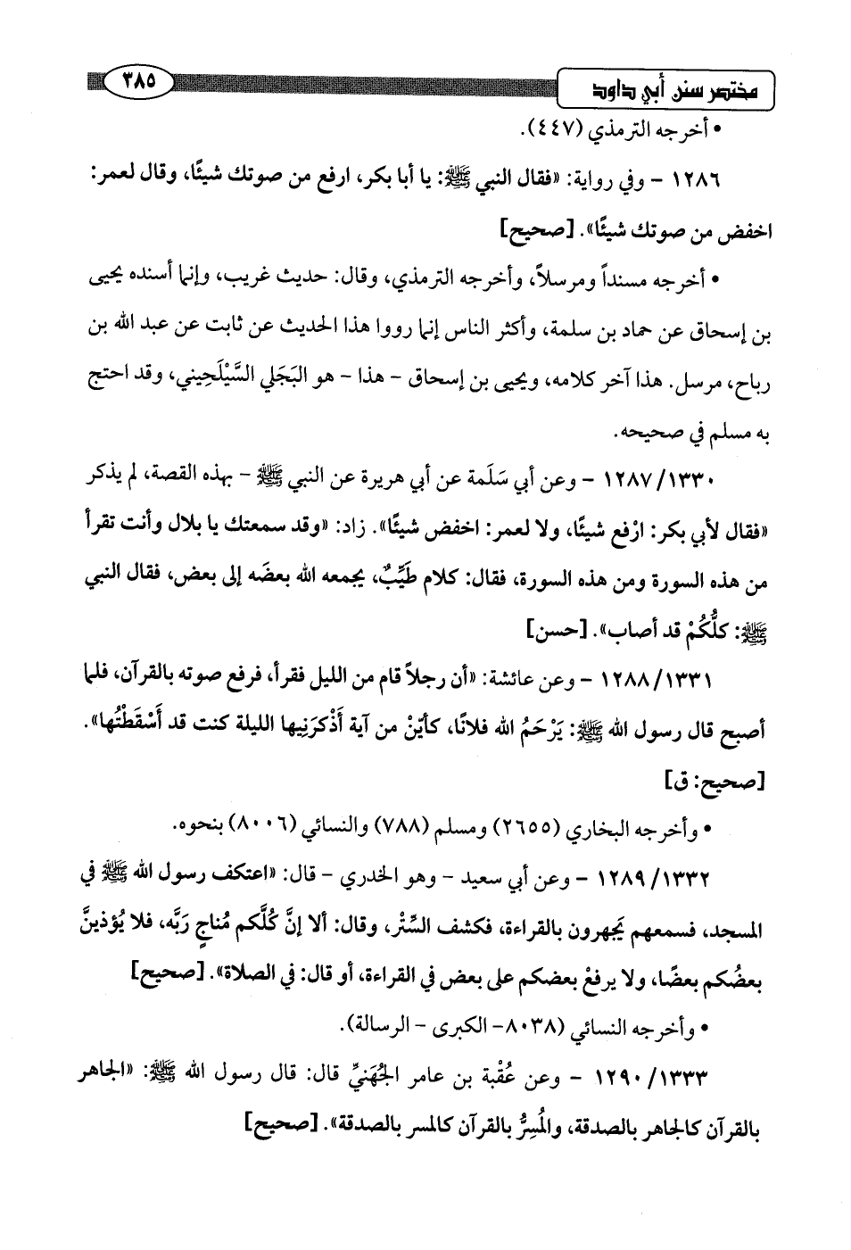 1330/ 1287 - وعن أبي سَلَمة عن أبي هريرة عن النبي -صلى اللَّه عليه وسلم- بهذه القصة، لم يذكر "فقال لأبي بكر: ارْفع شيئًا، ولا لعمر: اخفض شيئًا". زاد: "وقد سمعتك يَا بلال وأنت تقرأ من هذه السورة ومن هذه السورة، فقال: كلام طَيِّبٌ، يجمعه اللَّه بعضَه إلى بعض، فقال النبي -صلى اللَّه عليه وسلم-: كلُّكُمْ قد أصاب".hحسن]