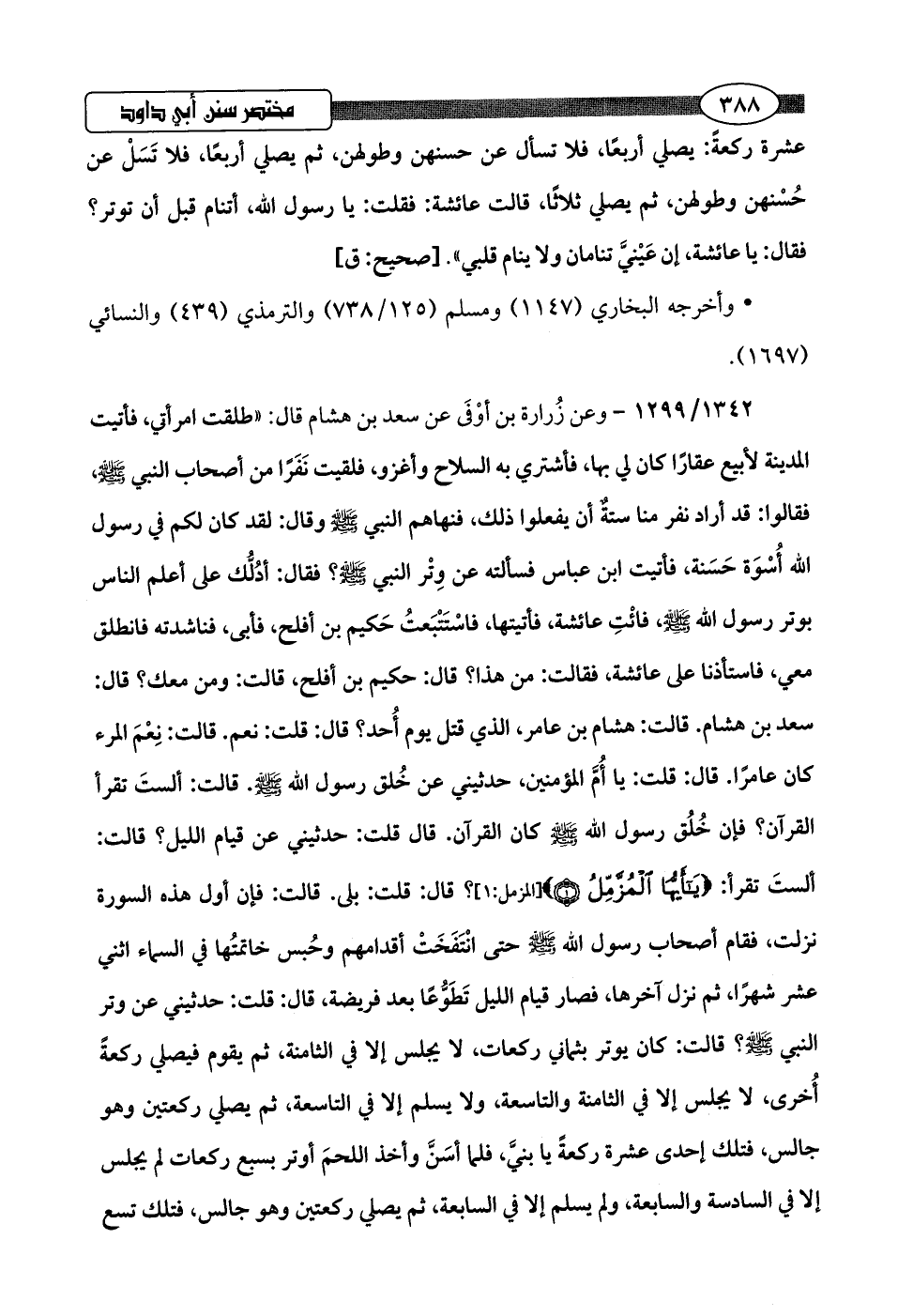 1342/ 1299 - وعن زُرارة بن أوْفَى عن سعد بن هشام قال: "طلقت امرأتي، فأتيت المدينة لأبيع عقارًا كان لي بها، فأشتري به السلاح وأغزو، فلقيت نَفَرًا من أصحاب النبي -صلى اللَّه عليه وسلم-، فقالوا: قد أراد نفر منا ستةٌ أن يفعلوا ذلك، فنهاهم النبي -صلى اللَّه عليه وسلم- وقال: لقد كان لكم في رسول اللَّه أُسْوَة حَسَنة، فأتيت ابن عباس فسألته عن وِتْر النبي -صلى اللَّه عليه وسلم-؟ فقال: أدُلُّك على أعلم الناس بوتر رسول اللَّه -صلى اللَّه عليه وسلم-، فائْتِ عائشة، فأتيتها، فاسْتَتْبَعتُ حَكيم بن أفلح، فأبى، فناشدته فانطلق معي، فاستأذنا على عائشة، فقالت: من هذا؟ قال: حكيم بن أفلح، قالت: ومن معك؟ قال: سعد بن هشام. قالت: هشام بن عامر، الذي قتل يوم أُحد؟ قال: قلت: نعم. قالت: نِعْمَ المرء كان عامرًا. قال: قلت: يَا أُمَّ المؤمنين، حدثيني عن خُلق رسول اللَّه -صلى اللَّه عليه وسلم-. قالت: ألستَ تقرأ القرآن؟ فإن خُلُق رسول اللَّه -صلى اللَّه عليه وسلم- كان القرآن. قال قلت: حدثيني عن قيام الليل؟ قالت: ألستَ تقرأ: {يَاأَيُّهَا الْمُزَّمِّلُ (1)} [المزمل: 1]؟ قال: قلت: بلى. قالت: فإن أول هذه السورة نزلت، فقام أصحاب رسول اللَّه -صلى اللَّه عليه وسلم- حتى انْتَفَخَتْ أقدامهم وحُبس خاتمتُها في السماء اثني عشر شهرًا، ثم نزل آخرها، فصار قيام الليل تَطَوُّعًا بعد فريضة، قال: قلت: حدثيني عن وتر النبي -صلى اللَّه عليه وسلم-؟ قالت: كان يوتر بثماني ركعات، لا يجلس إلا في الثامنة، ثم يقوم فيصلي ركعةً أُخرى، لا يجلس إلا في الثامنة والتاسعة، ولا يسلم إلا في التاسعة، ثم يصلي ركعتين وهو جالس، فتلك إحدى عشرة ركعةً يا بنيَّ، فلما أسَنَّ وأخذ اللحمَ أوتر بسبع ركعات لم يجلس إلا في السادسة والسابعة، ولم يسلم إلا في السابعة، ثم يصلي ركعتين وهو جالس، فتلك تسع