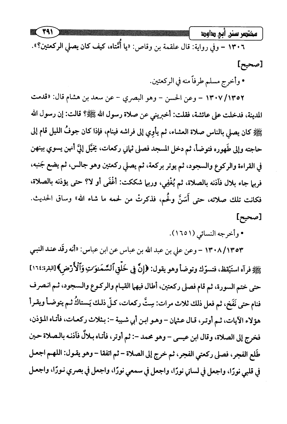 1353/ 1308 - وعن علي بن عبد اللَّه بن عباس عن ابن عباس: "أنه رقَد عند النبي -صلى اللَّه عليه وسلم- فرآه استَيْقظ، فتسوّك وتوضأ وهو يقول: {إِنَّ فِي خَلْقِ السَّمَاوَاتِ وَالْأَرْضِ} [البقرة: 164] حتى ختم السورة، ثم قام فصلى ركعتين، أطال فيهما القيام والركوع والسجود، ثم انصرف فنام حتى نَفَخ، ثم فعل ذلك ثلاث مرات: سِتَّ ركعات، كلّ ذلك يَستاكُ ثم يتوضأ ويقرأ هؤلاء الآيات، ثم أوتر، قال عثمان -وهو ابن أبي شيبة-: بثلاث ركعات، فأتاه المؤذن، فخرج إلى الصلاة، وقال ابن عيسى -وهو محمد-: ثم أوتر، فأتاه بلالٌ فآذنه بالصلاة حين طَلع الفجر، فصلى ركعتي الفجر، ثم خرج إلى الصلاة -ثم اتفقا- وهو يقول: اللهم اجعل في قلبي نورًا، واجعل في لساني نورًا، واجعل في سمعي نورًا، واجعل في بصري نورًا، واجعل