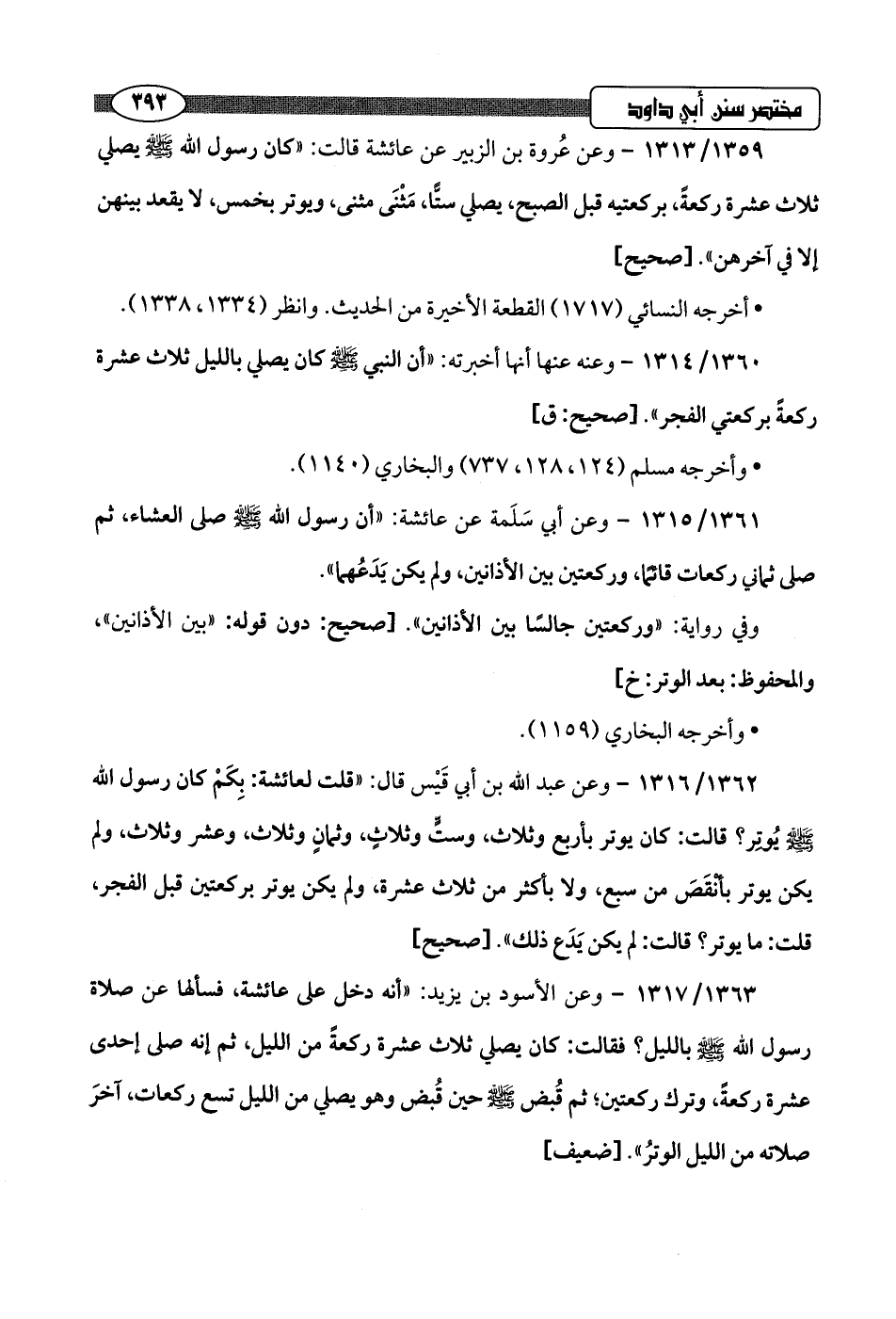 1362/ 1316 - وعن عبد اللَّه بن أبي قَيْس قال: "قلت لعائشة: بِكَمْ كان رسول اللَّه -صلى اللَّه عليه وسلم- يُوتِر؟ قالت: كان يوتر بأربع وثلاث، وستٍّ وثلاثٍ، وثمانٍ وثلاث، وعشر وثلاث، ولم يكن يوتر بأنقَصَ من سبع، ولا بأكثر من ثلاث عشرة، ولم يكن يوتر بركعتين قبل الفجر، قلت: ما يوتر؟ قالت: لم يكن يَدَع ذلك".hصحيح]