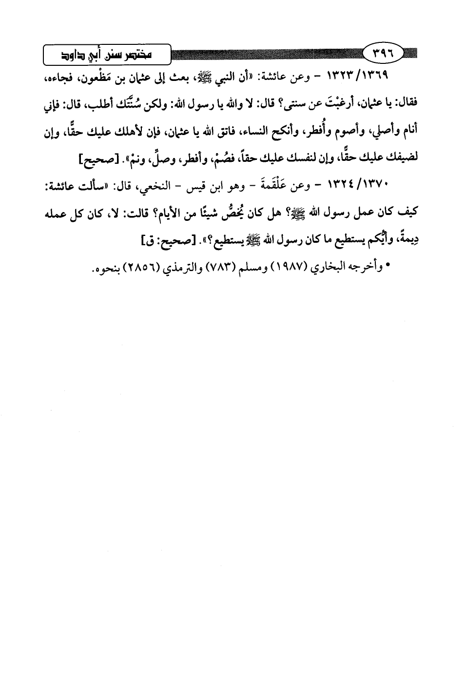 1369/ 1323 - وعن عائشة: "أن النبي -صلى اللَّه عليه وسلم-، بعث إلى عثمان بن مَظْعون، فجاءه، فقال: يَا عثمان، أرغبْتَ عن سنتي؟ قال: لا واللَّه يَا رسول اللَّه: ولكن سُنَّتَك أطلب، قال: فإنِّي أنام وأصلي، وأصوم وأُفطر، وأنكح النساء، فاتق اللَّه يَا عثمان، فإن لأهلك عليك حقًّا، وإن لضيفك عليك حقًّا، وإن لنفسك عليك حقًّا، فصُمْ، وأفطر، وصلِّ، ونمْ".hصحيح]